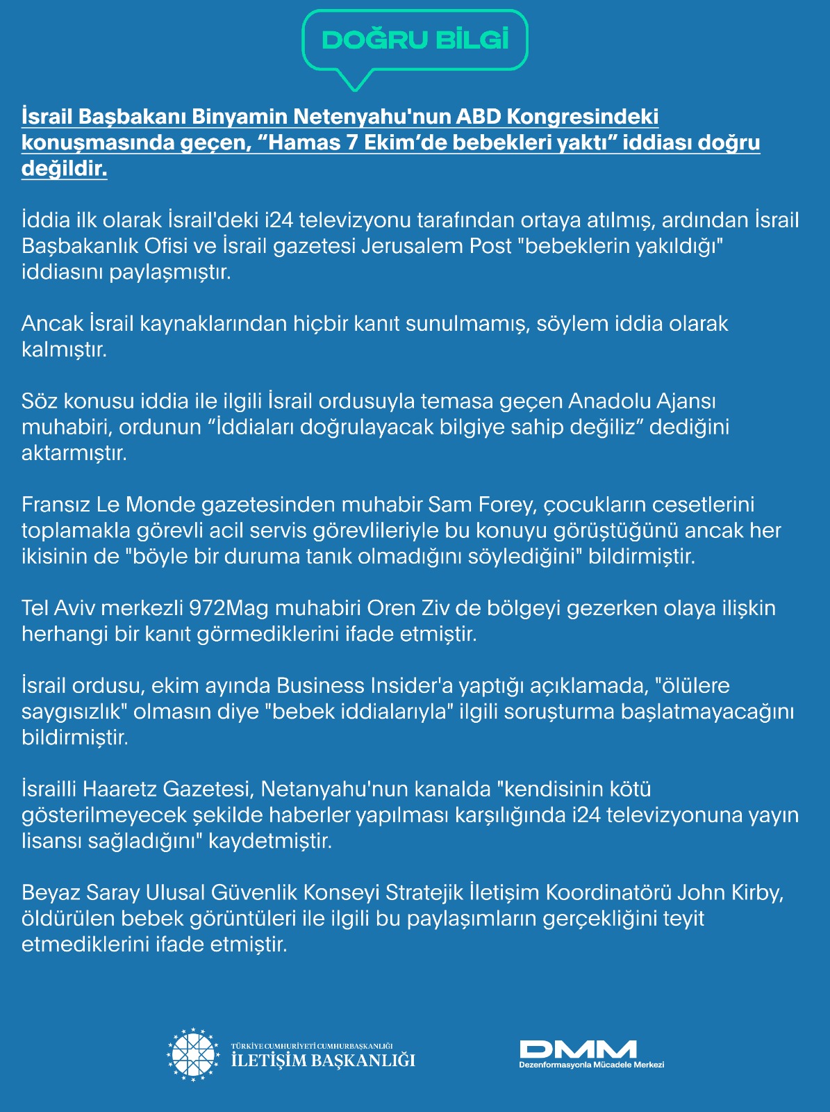 İsrail Başbakanı Binyamin Netenyahu'nun ABD Kongresindeki konuşmasında geçen, “Hamas 7 Ekim’de bebekleri yaktı” iddiası doğru değildir.