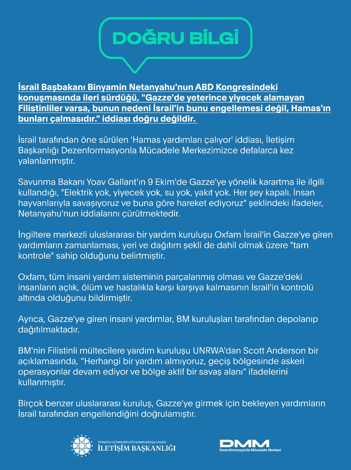 İsrail tarafından öne sürülen 'Hamas yardımları çalıyor' iddiası, İletişim Başkanlığı Dezenformasyonla Mücadele Merkezimizce defalarca kez yalanlanmıştır.