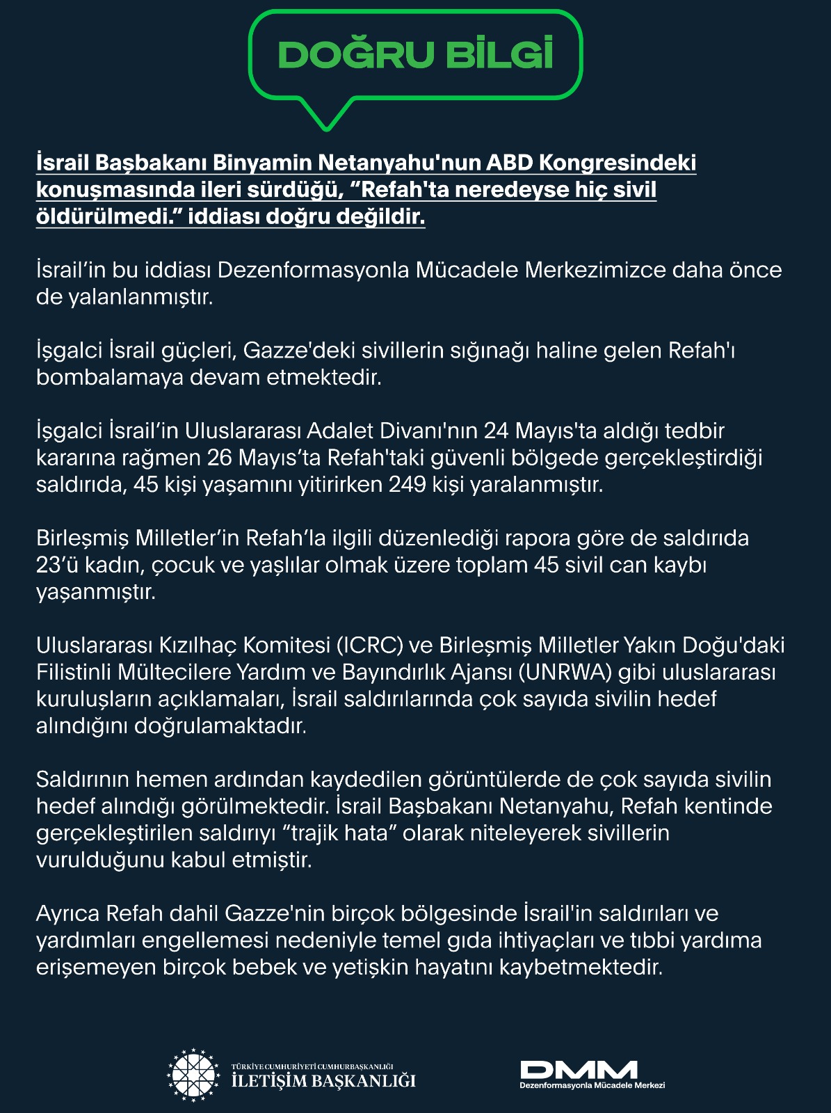 İsrail Başbakanı Binyamin Netanyahu'nun ABD Kongresindeki konuşmasında ileri sürdüğü, “Refah'ta neredeyse hiç sivil öldürülmedi.” iddiası doğru değildir.
