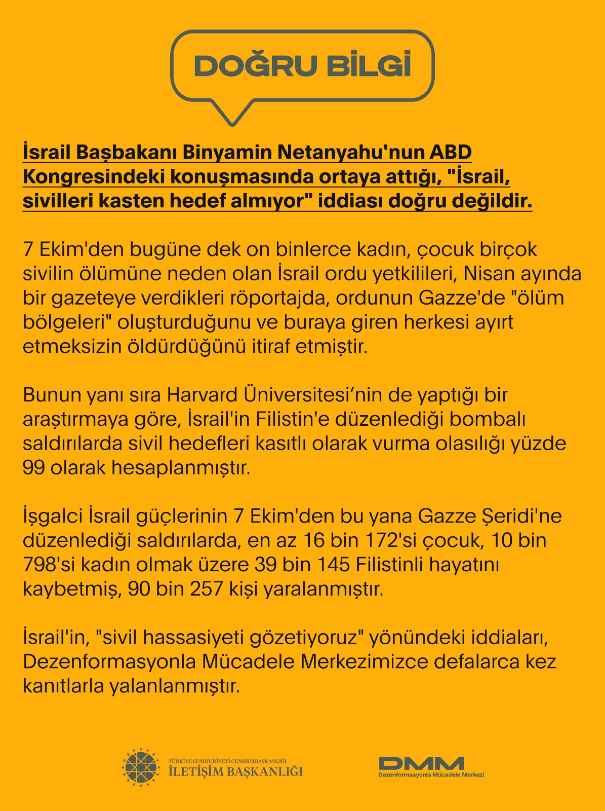 İsrail Başbakanı Binyamin Netanyahu'nun ABD Kongresindeki konuşmasında ortaya attığı, "İsrail, sivilleri kasten hedef almıyor" iddiası doğru değildir.