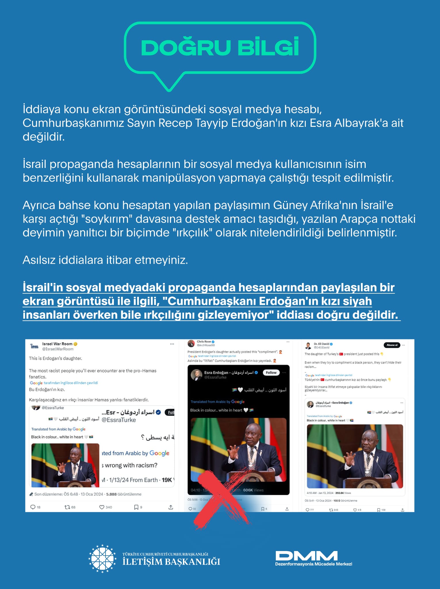 İsrail'in, sosyal medyadaki propaganda hesaplarından paylaşılan bir ekran görüntüsü ile ilgili, "Cumhurbaşkanı Erdoğan'ın kızı siyah insanları överken bile ırkçılığını gizleyemiyor" iddiası doğru değildir.