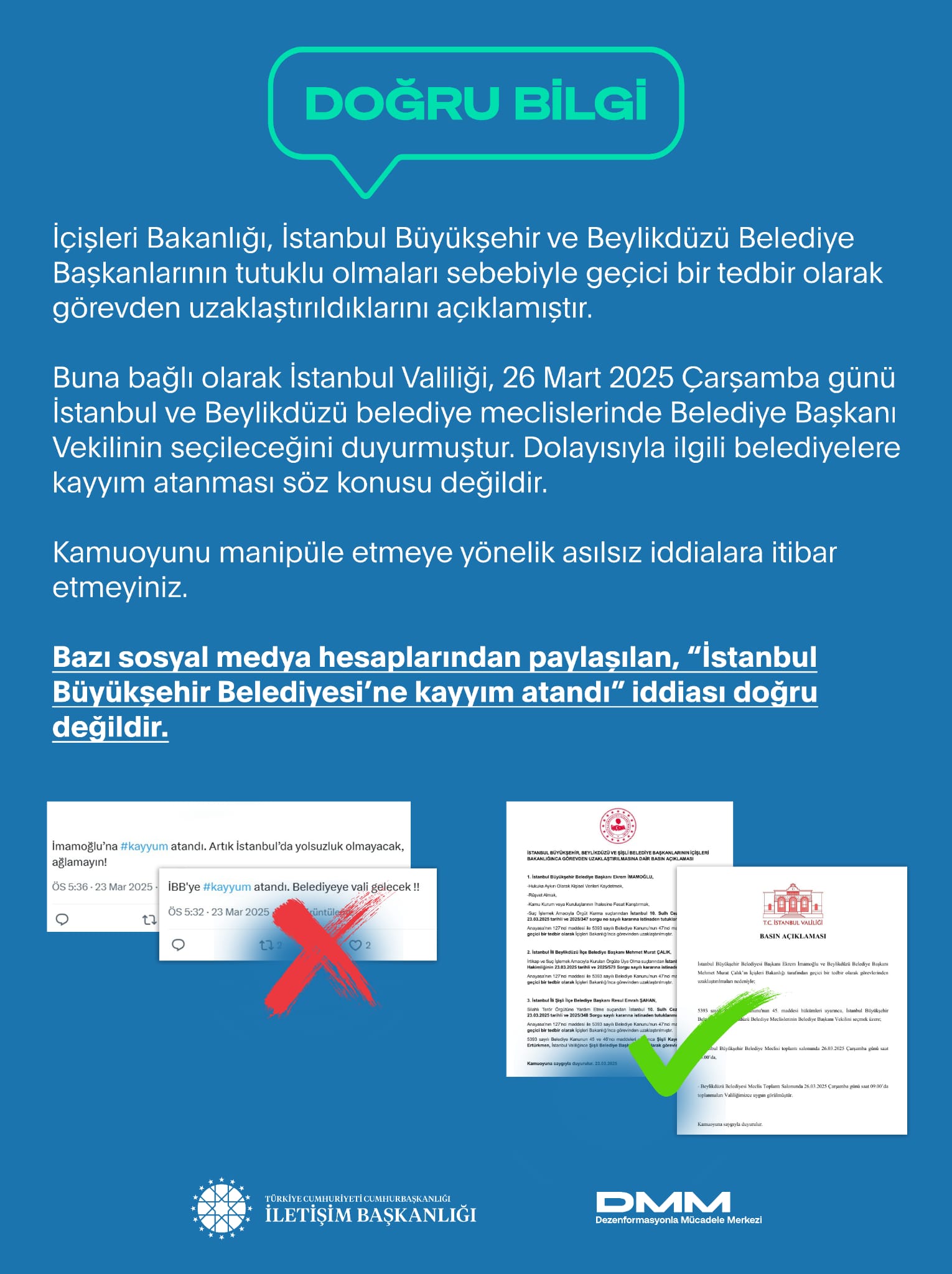 Buna bağlı olarak İstanbul Valiliği, 26 Mart 2025 Çarşamba günü İstanbul ve Beylikdüzü belediye meclislerinde Belediye Başkanı Vekilinin seçileceğini duyurmuştur. Dolayısıyla ilgili belediyelere kayyım atanması söz konusu değildir.
