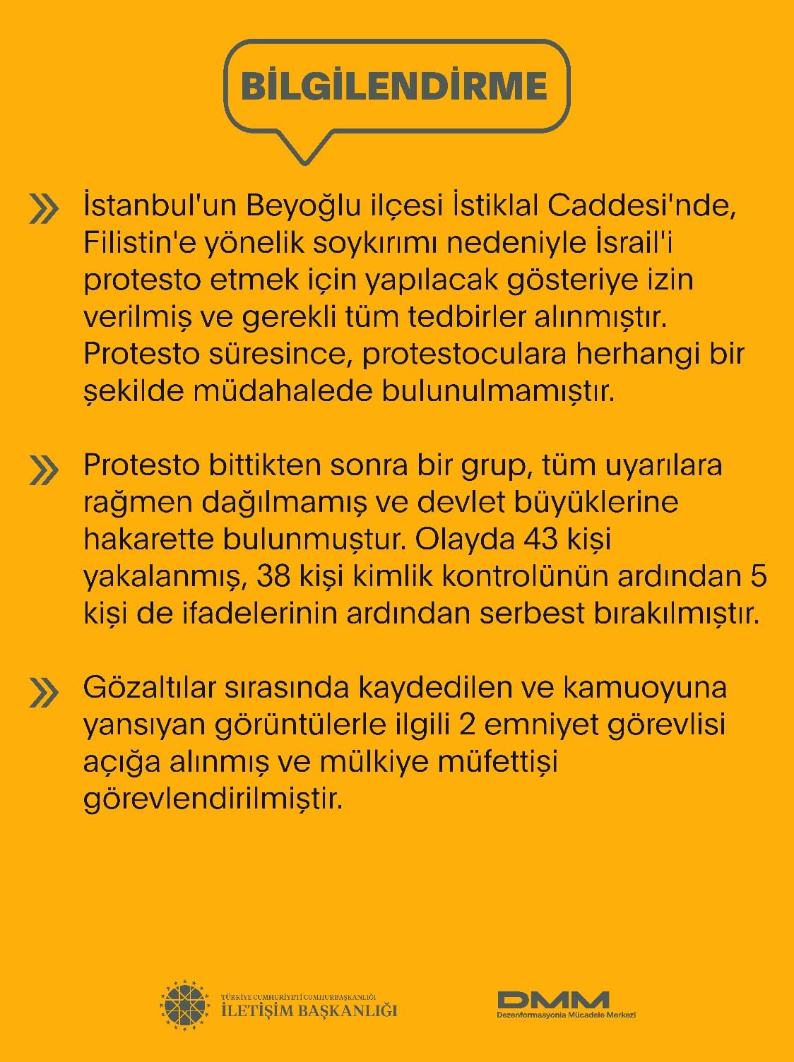 İstanbul'un Beyoğlu ilçesi İstiklal Caddesi'nde, Filistin'e yönelik soykırımı nedeniyle İsrail'i protesto etmek için yapılacak gösteriye izin verilmiş ve gerekli tüm tedbirler alınmıştır. Protesto süresince, protestoculara herhangi bir şekilde müdahalede bulunulmamıştır.