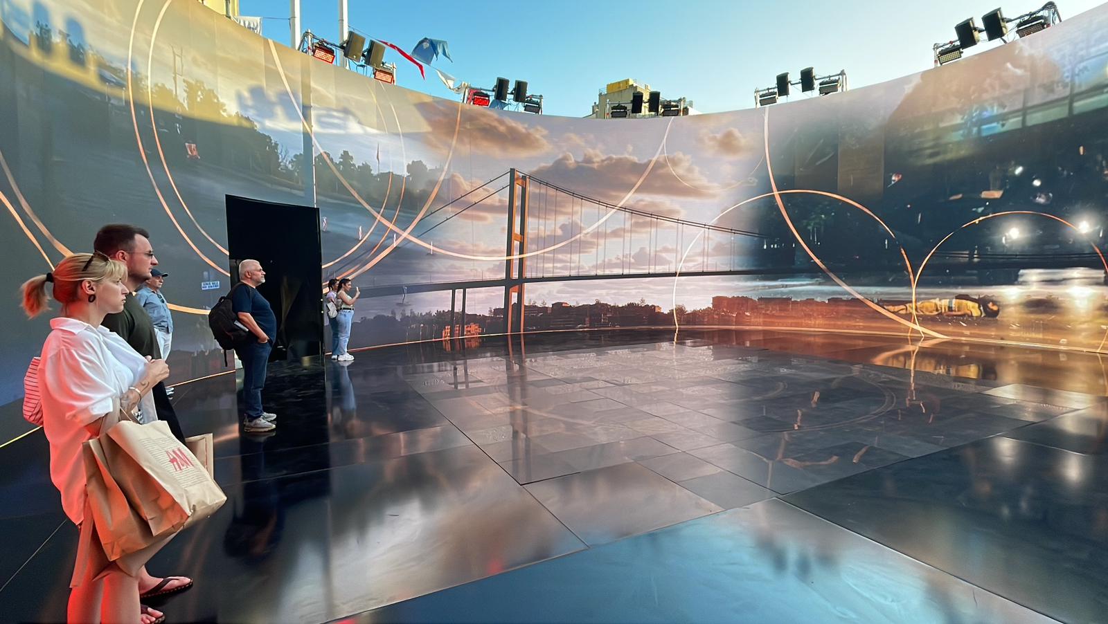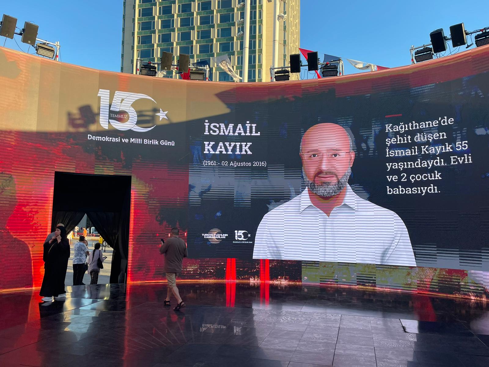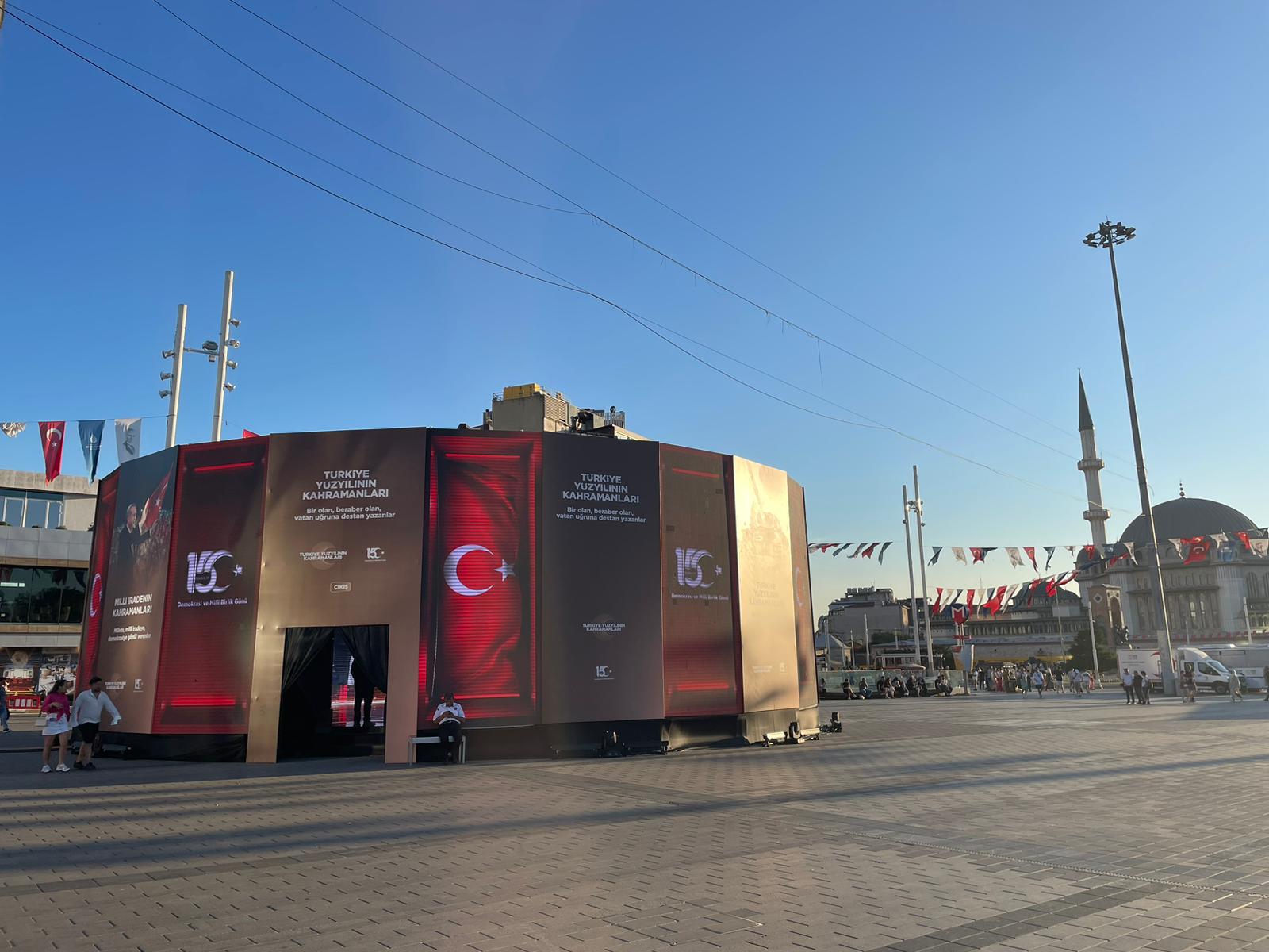 Taksim Meydanı'na kurulan 360 derece deneyim alanında, 3 boyutlu ekranlarda, 15 Temmuz kahramanlarının mücadelesi anlatıldı.