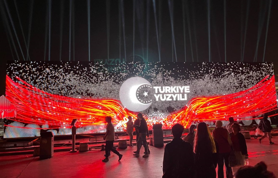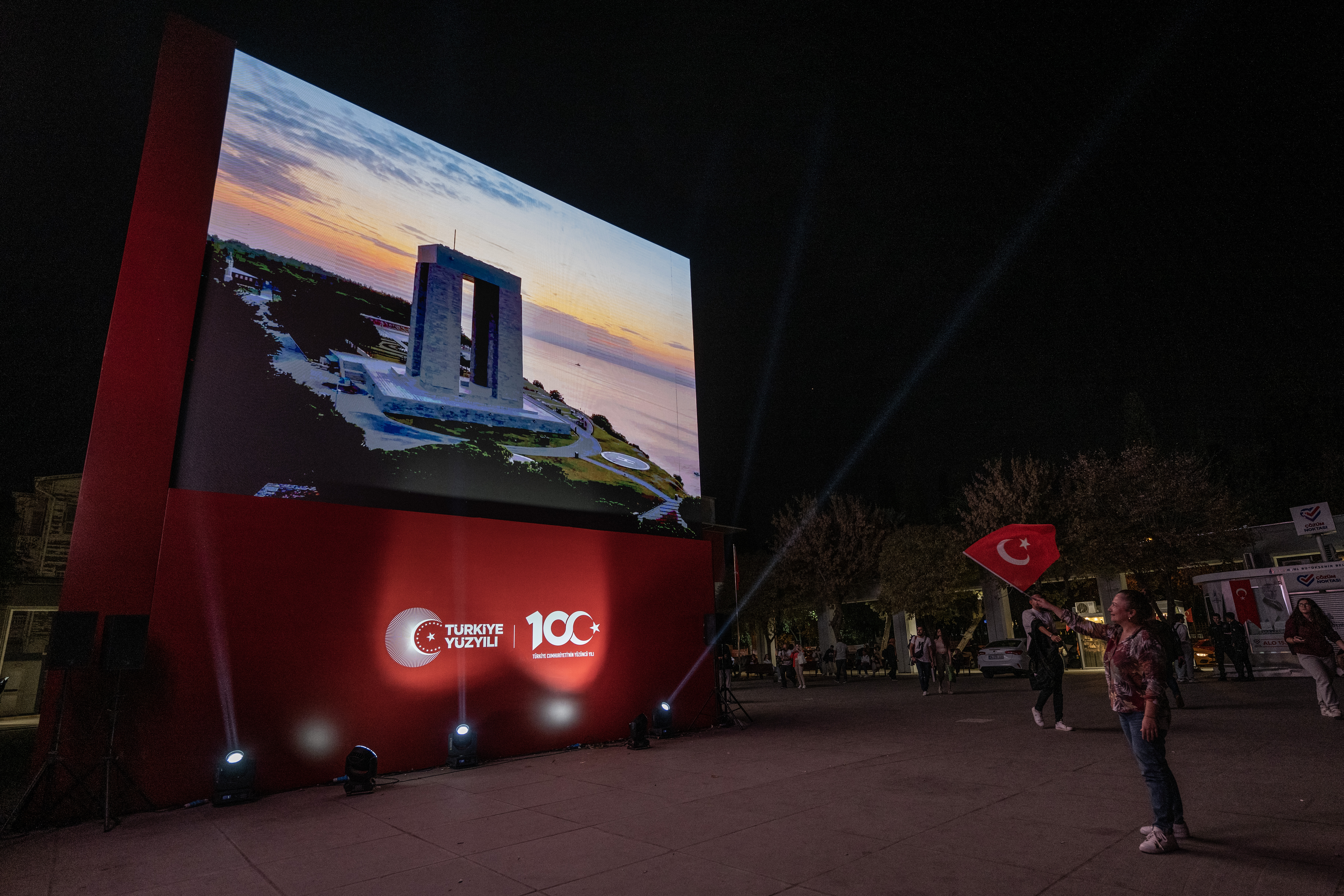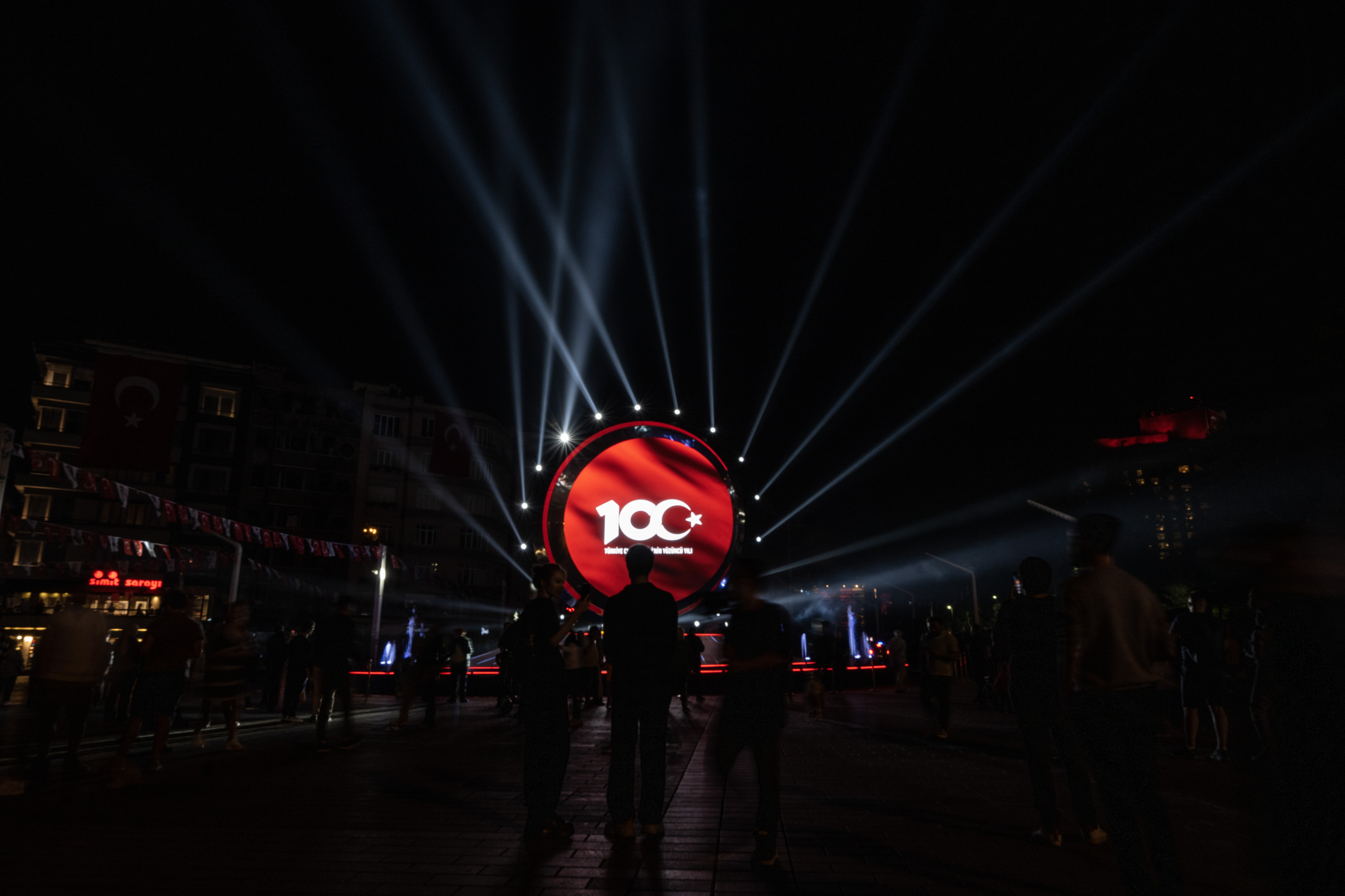 Taksim Gezi Parkı'nın önüne kurulan dev ekranda ise "Türkiye Yüzyılı" resmî logosundan esinlenilerek hazırlanan "Türkiye Yüzyılı Enstalasyonu" ile 100. yıl içerikleri vatandaşların dikkatine sunuluyor.