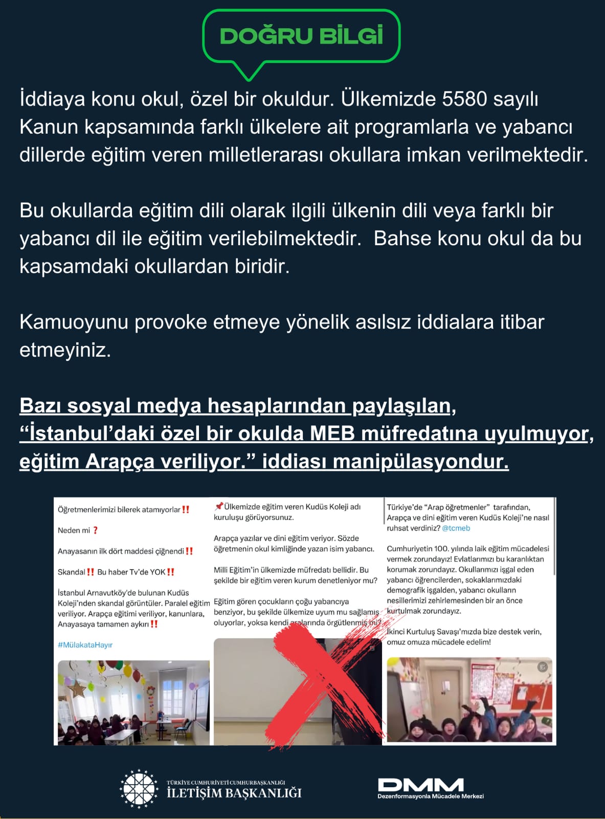 Bazı sosyal medya hesaplarından paylaşılan, “İstanbul’daki özel bir okulda MEB müfredatına uyulmuyor, eğitim Arapça veriliyor.” iddiası manipülasyondur.
