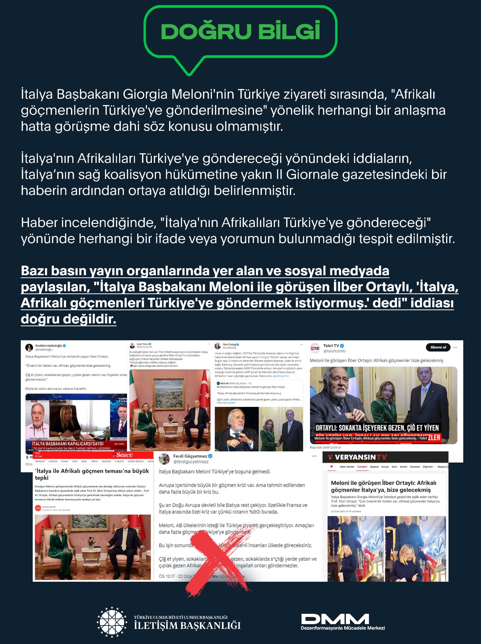 İtalya Başbakanı Giorgia Meloni'nin Türkiye ziyareti sırasında, "Afrikalı göçmenlerin Türkiye'ye gönderilmesine" yönelik herhangi bir anlaşma hatta görüşme dahi söz konusu olmamıştır.