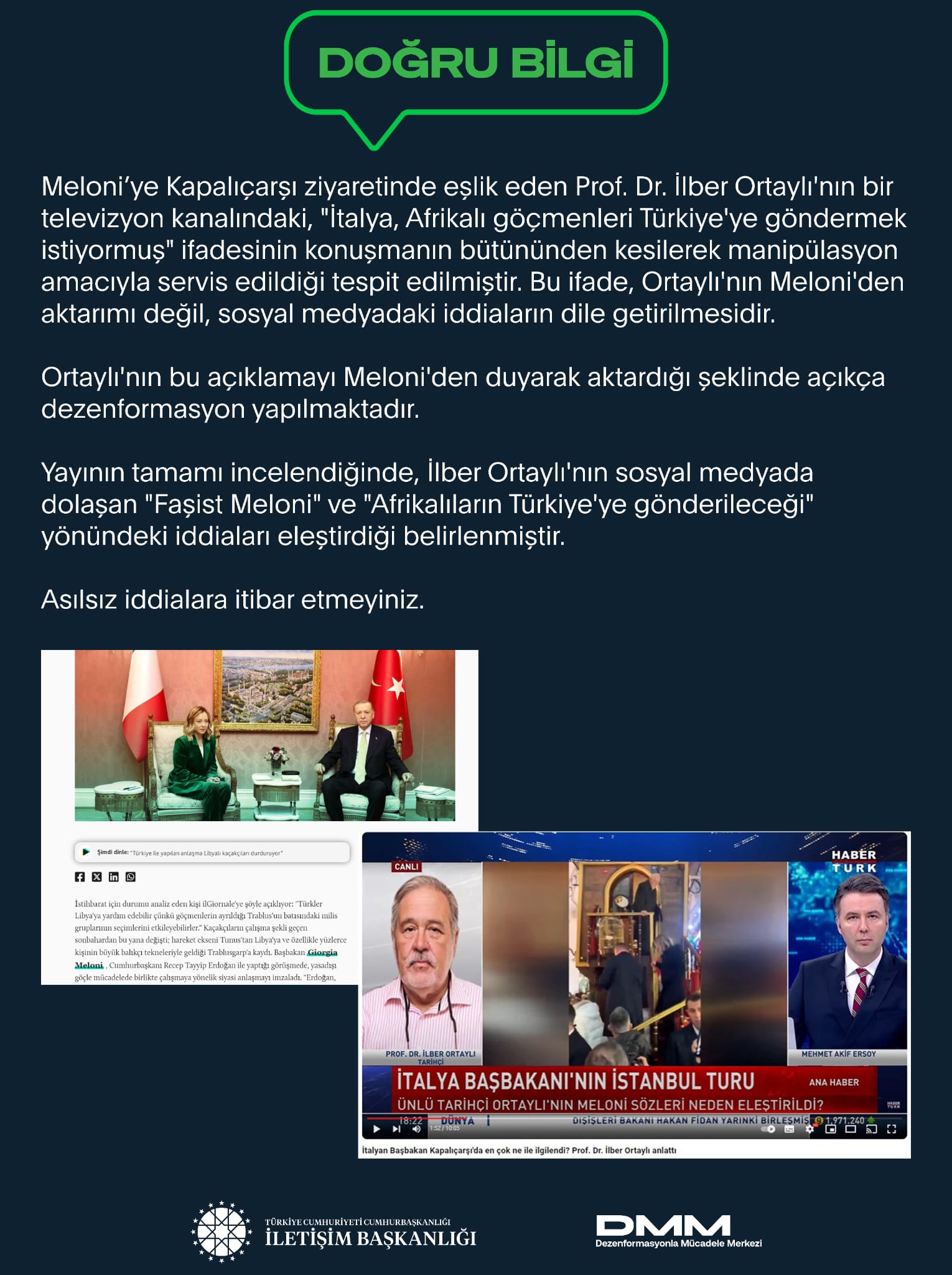Meloni’ye Kapalıçarşı ziyaretinde eşlik eden Prof. Dr. İlber Ortaylı'nın bir televizyon kanalındaki, "İtalya, Afrikalı göçmenleri Türkiye'ye göndermek istiyormuş" ifadesinin konuşmanın bütününden kesilerek manipülasyon amacıyla servis edildiği tespit edilmiştir. Bu ifade, Ortaylı'nın Meloni'den aktarımı değil, sosyal medyadaki iddiaların dile getirilmesidir.