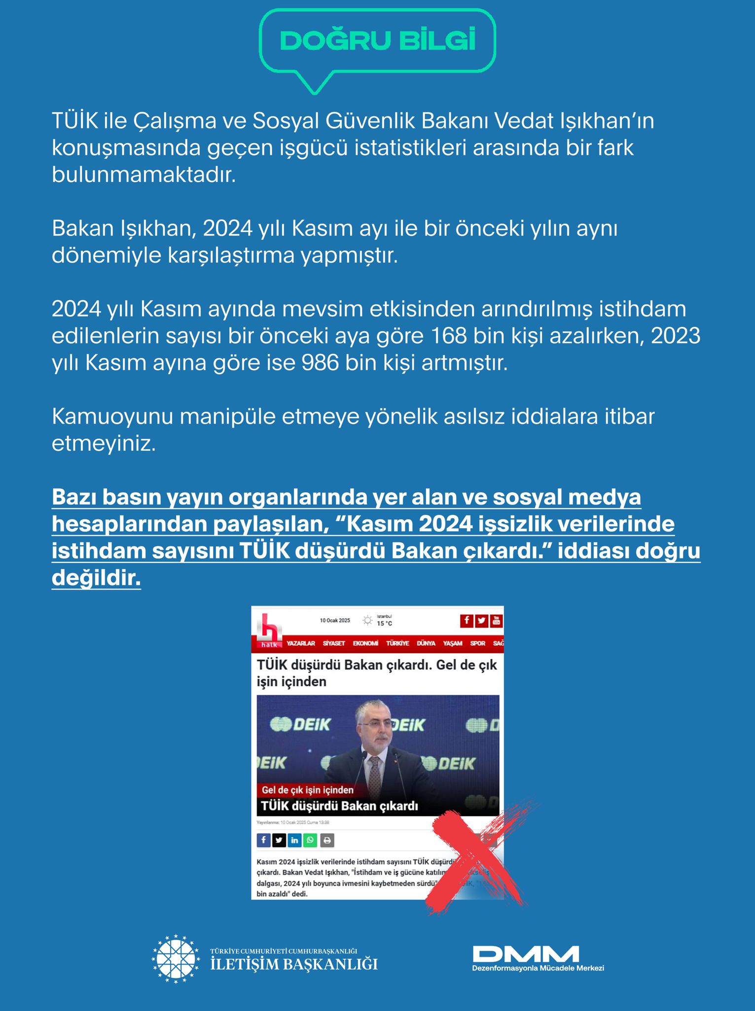 Bazı basın yayın organlarında yer alan ve sosyal medya hesaplarından paylaşılan “Kasım 2024 işsizlik verilerinde istihdam sayısını TÜİK düşürdü Bakan çıkardı.” iddiası doğru değildir.