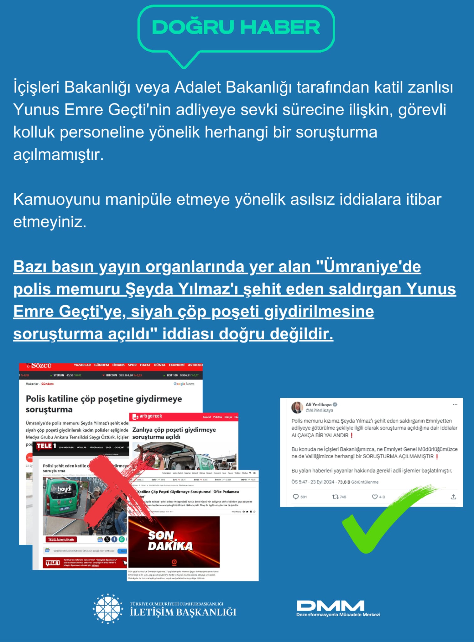 Bazı basın yayın organlarında yer alan "Ümraniye'de polis memuru Şeyda Yılmaz'ı şehit eden saldırgan Yunus Emre Geçti'ye, siyah çöp poşeti giydirilmesine soruşturma açıldı" iddiası doğru değildir.
