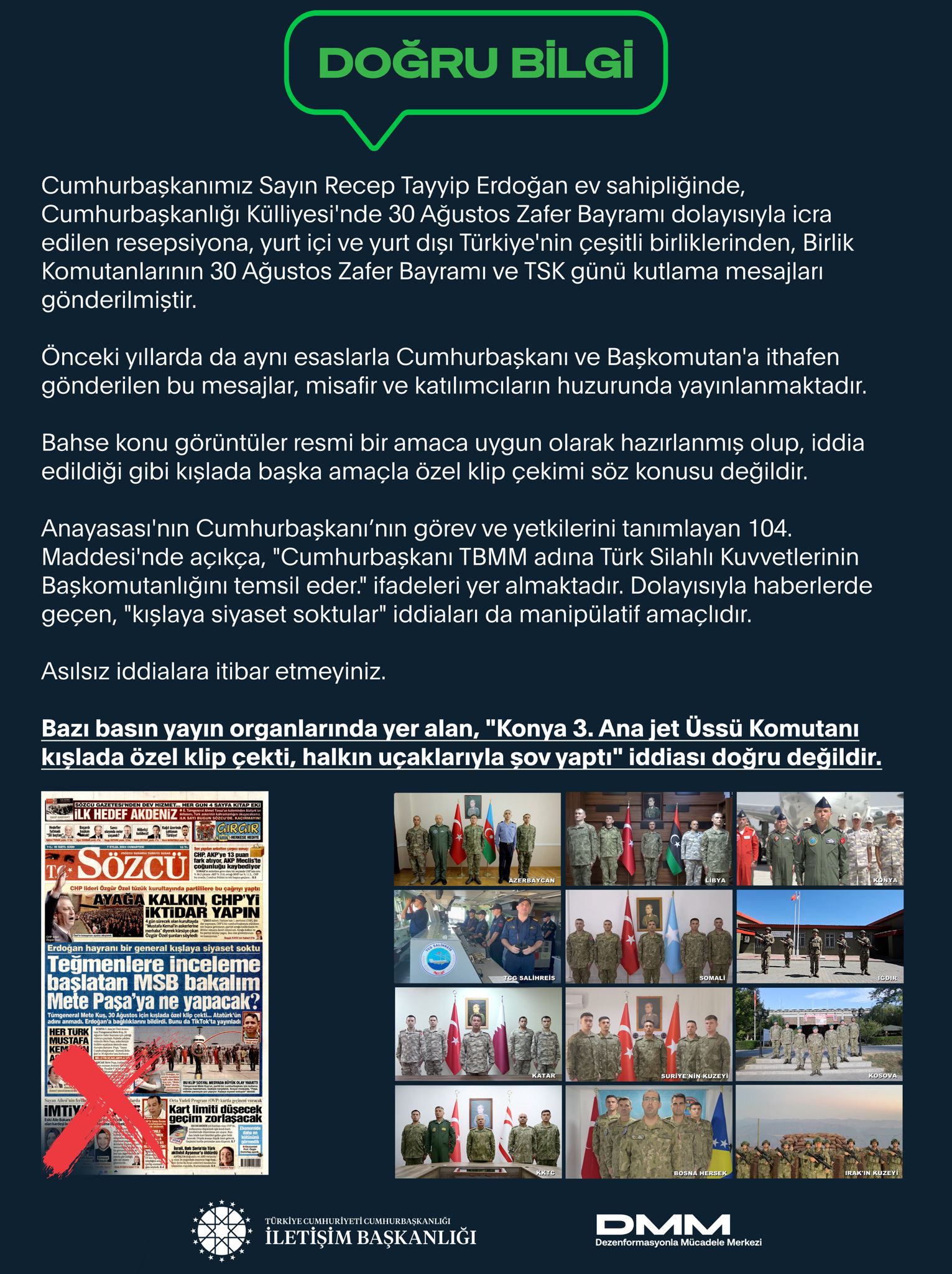 Anayasası'nın Cumhurbaşkanı’nın görev ve yetkilerini tanımlayan 104. Maddesi'nde açıkça, "Cumhurbaşkanı TBMM adına Türk Silahlı Kuvvetlerinin Başkomutanlığını temsil eder." ifadeleri yer almaktadır. Dolayısıyla haberlerde geçen, "kışlaya siyaset soktular" iddiaları da manipülatif amaçlıdır.