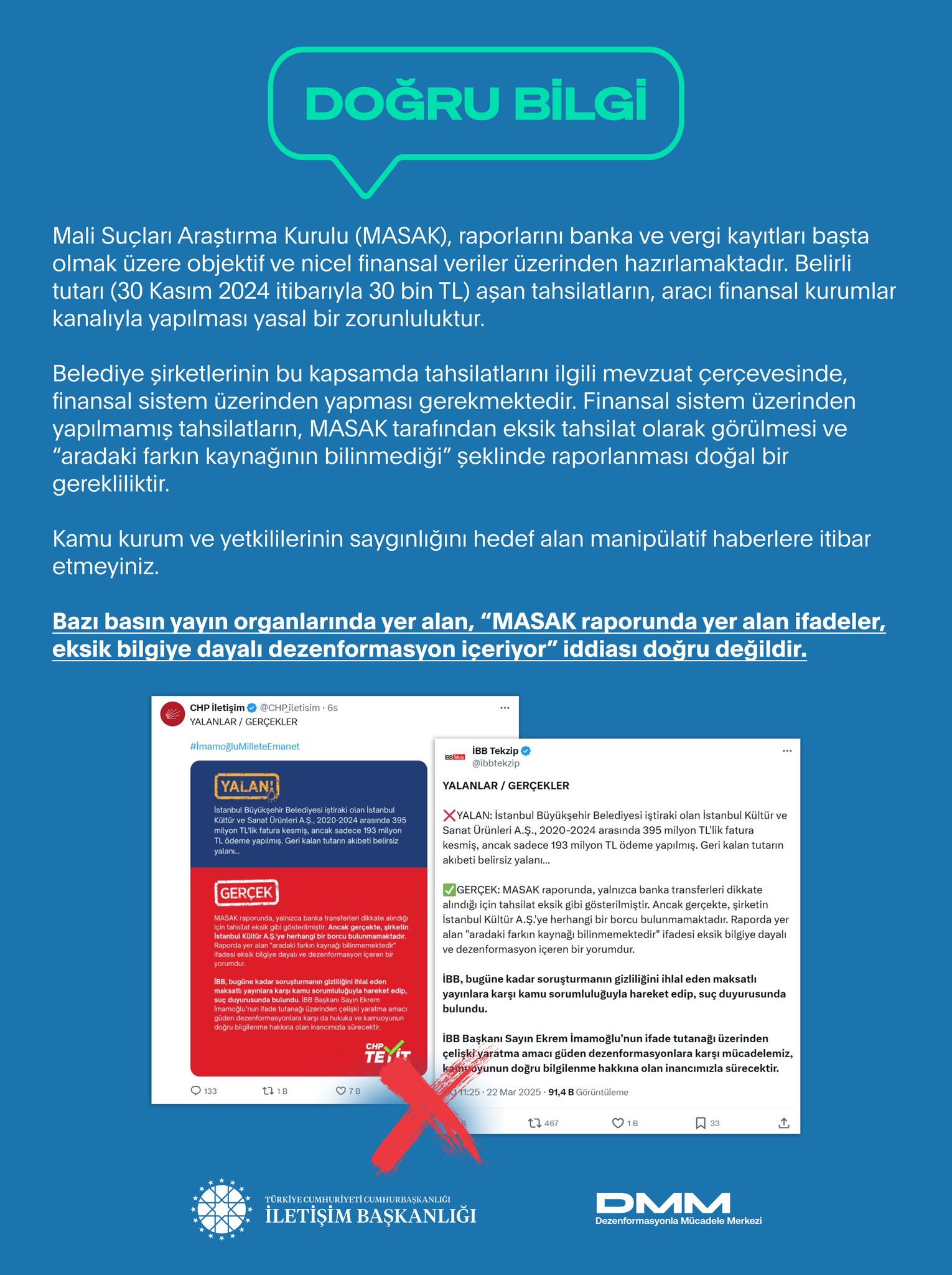 Bazı basın yayın organlarında yer alan “MASAK raporunda yer alan ifadeler, eksik bilgiye dayalı dezenformasyon içeriyor” iddiası doğru değildir.