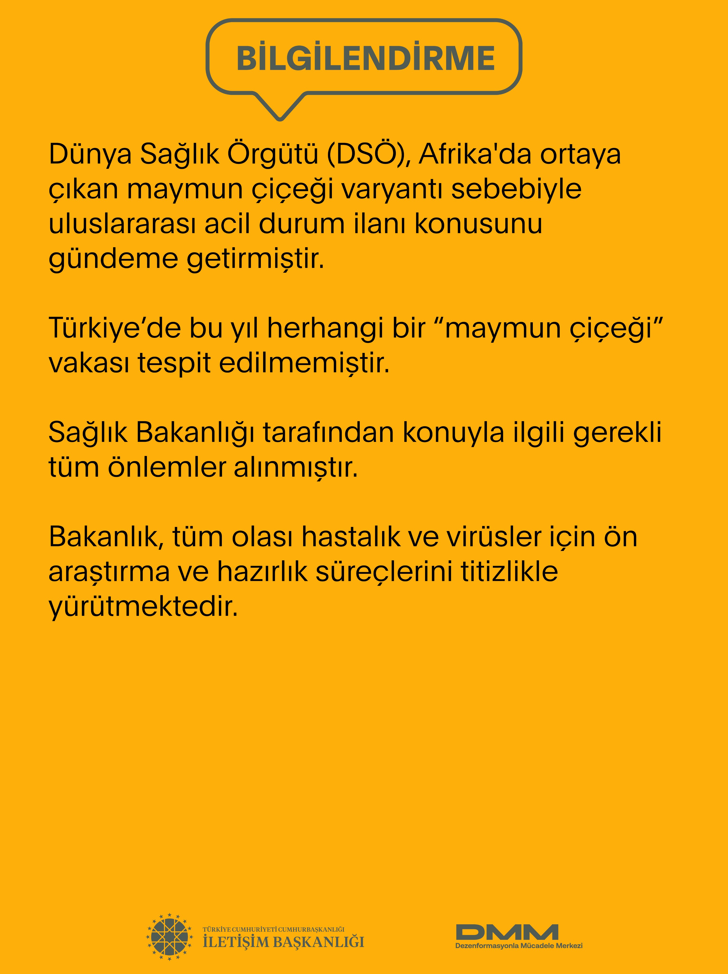 Türkiye'de bu yıl herhangi bir 'maymun çiçeği' vakası tespit edilmemiştir. Sağlık Bakanlığı tarafından konuyla ilgili gerekli tüm önlemler alınmıştır. Bakanlık, tüm olası hastalık ve virüsler için ön araştırma ve hazırlık süreçlerini titizlikle yürütmektedir.