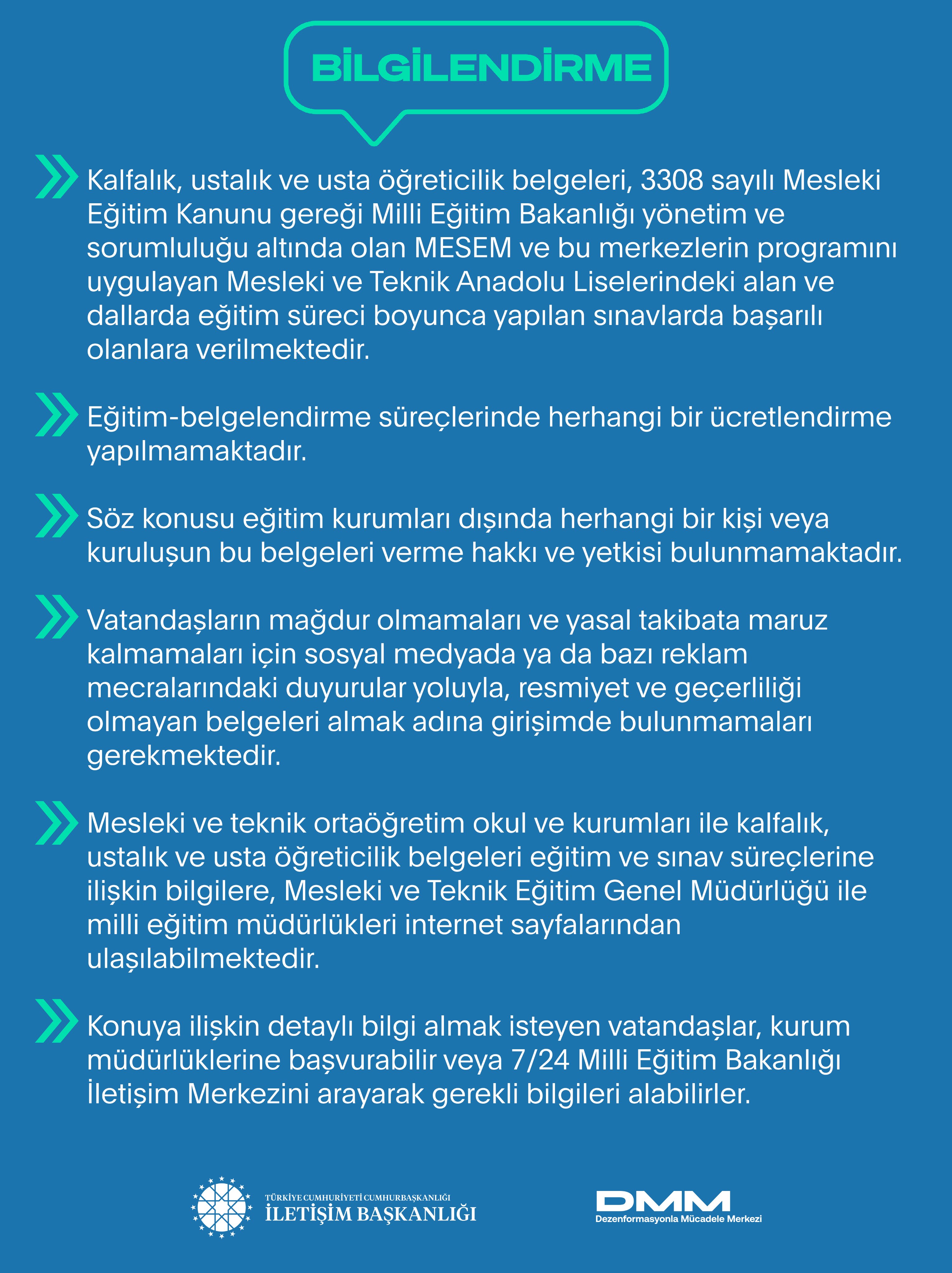 Mesleki ve teknik ortaöğretim okul ve kurumları ile kalfalık, ustalık ve usta öğreticilik belgeleri eğitim ve sınav süreçlerine ilişkin bilgilere, Mesleki ve Teknik Eğitim Genel Müdürlüğü ile millî eğitim müdürlükleri internet sayfalarından ulaşılabilmektedir.