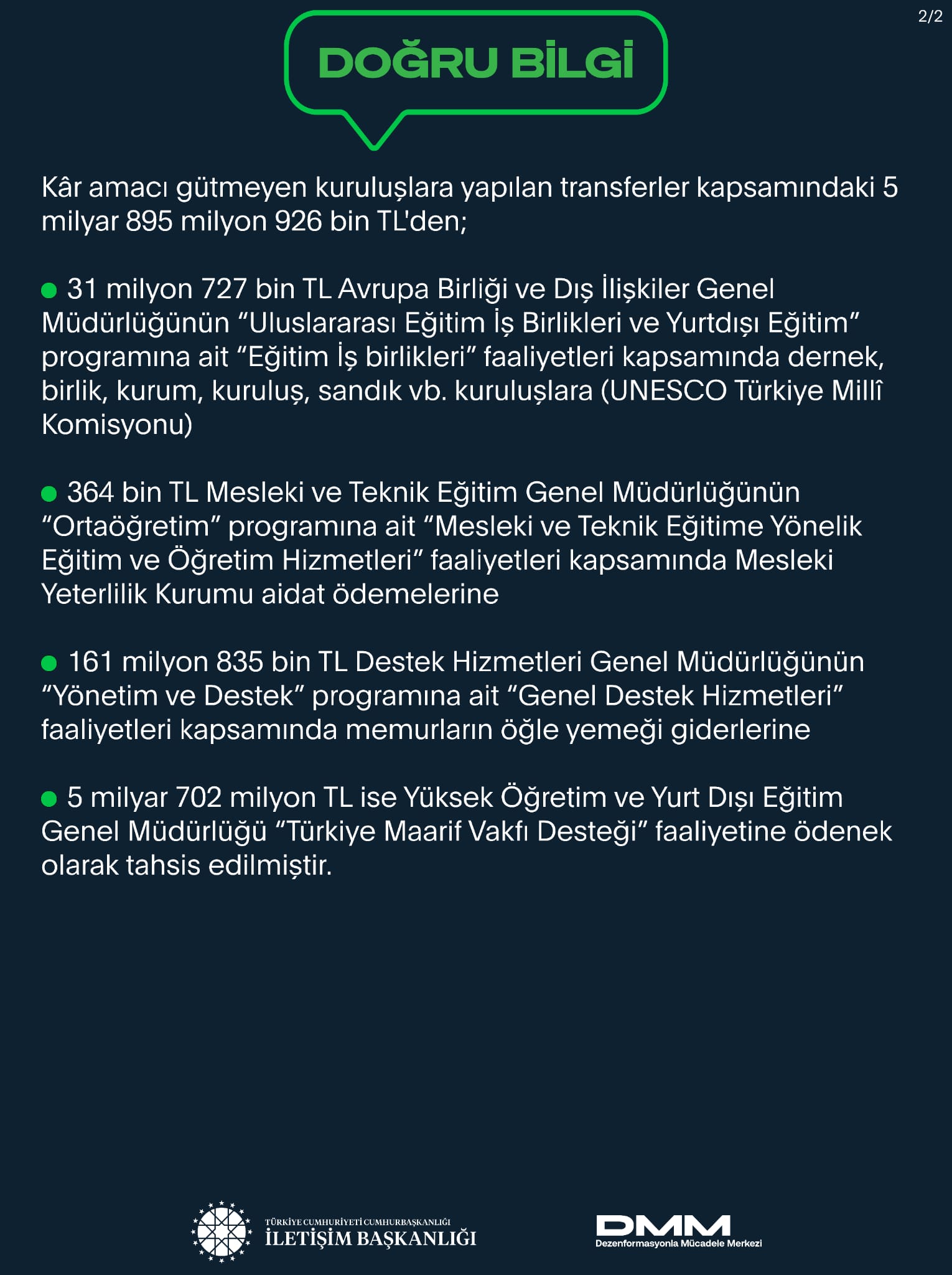 Bazı basın yayın organlarında yer alan ve sosyal medya hesaplarında paylaşılan, “Milli Eğitim Bakanlığı, tarikat ve cemaat vakıflarına bütçesinden 5 milyar 895 milyon 926 bin lira aktardı” iddiası doğru değildir.