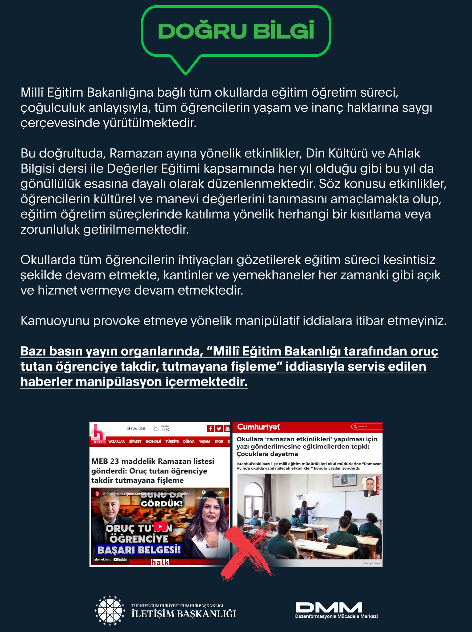 Bazı basın yayın organlarında, “Millî Eğitim Bakanlığı tarafından oruç tutan öğrenciye takdir, tutmayana fişleme” iddiasıyla servis edilen haberler manipülasyon içermektedir.