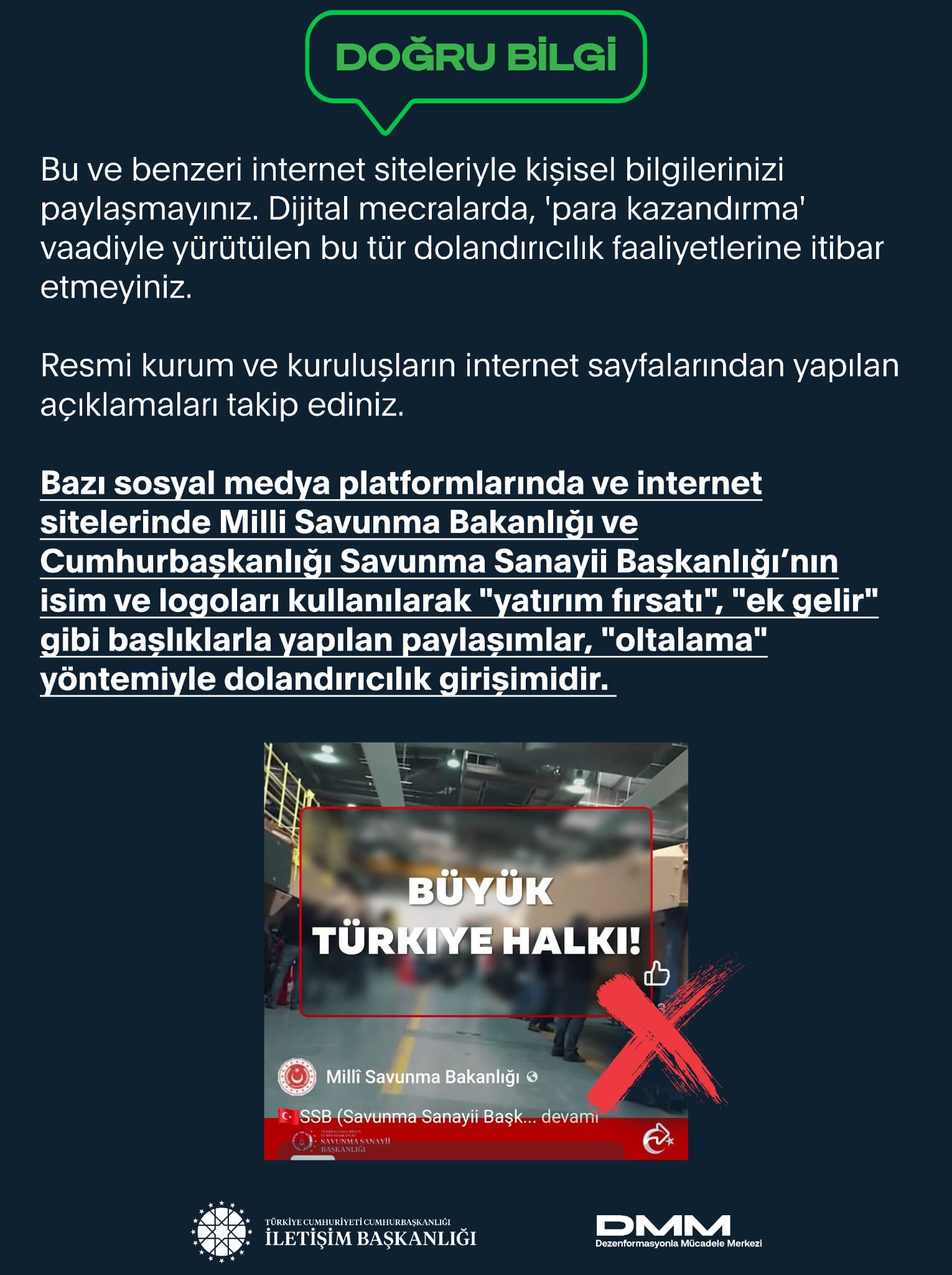 Bazı sosyal medya platformlarında ve internet sitelerinde Millî Savunma Bakanlığı (MSB) ve Cumhurbaşkanlığı Savunma Sanayii Başkanlığının isim ve logoları kullanılarak "yatırım fırsatı", "ek gelir" gibi başlıklarla yapılan paylaşımlar, "oltalama" yöntemiyle dolandırıcılık girişimidir.