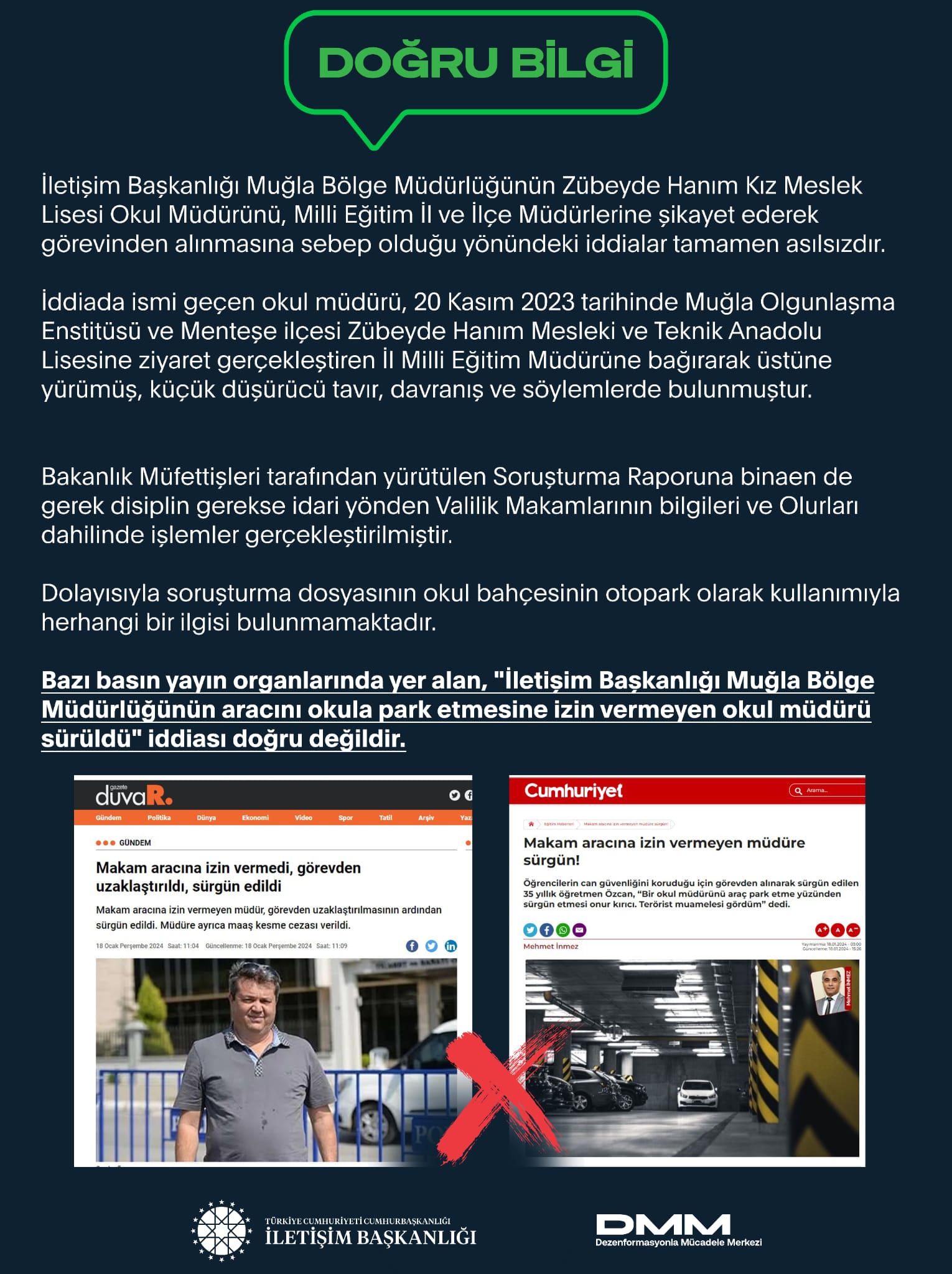 Bazı basın yayın organlarında yer alan, "İletişim Başkanlığı Muğla Bölge Müdürlüğüne ait aracın okula park edilmesine izin vermeyen okul müdürü sürüldü" iddiası doğru değildir.