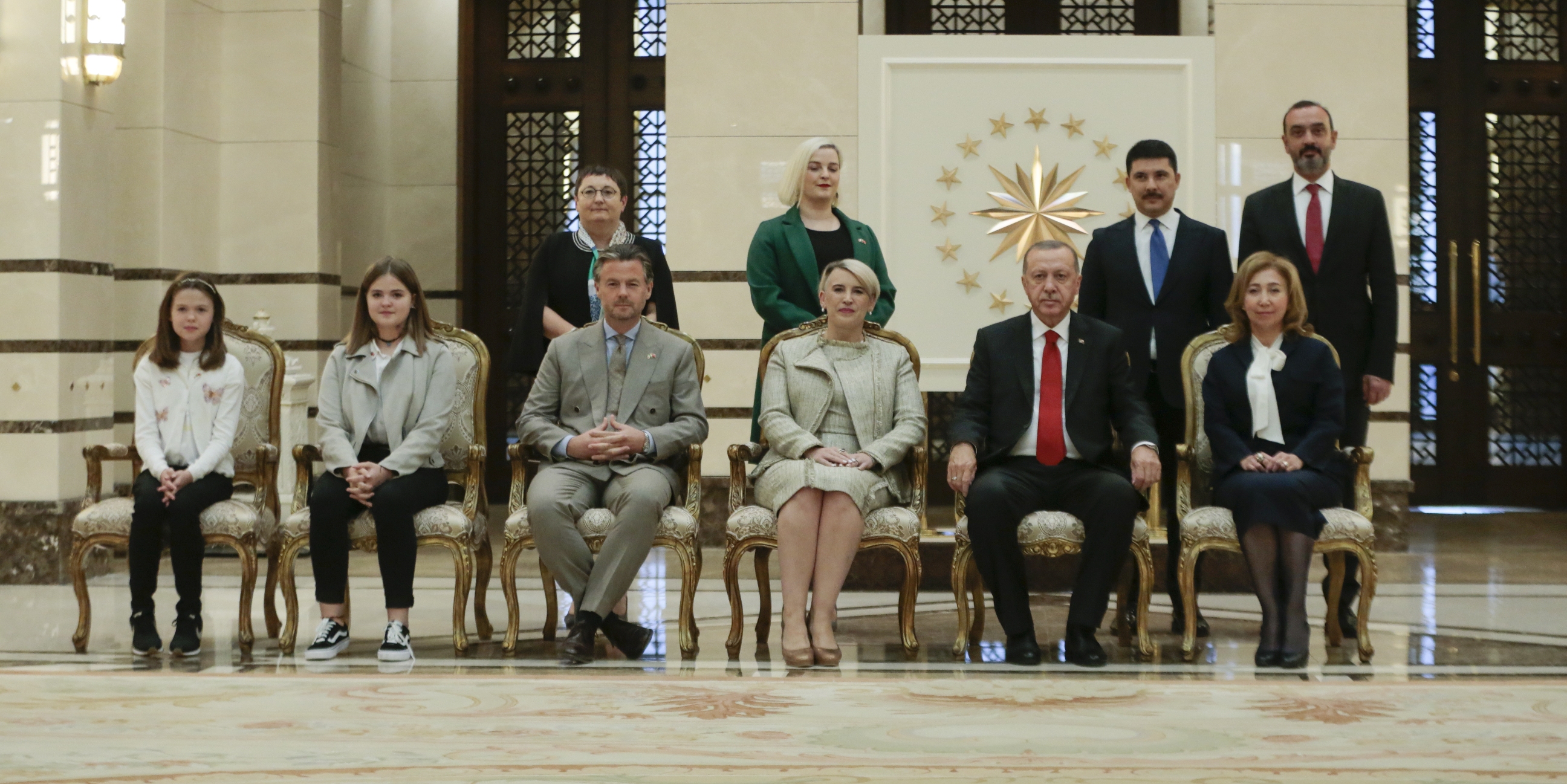 Büyükelçilerin aileleri ve bazı büyükelçilik mensuplarının Cumhurbaşkanı Erdoğan’a takdim edilmesinin ardından hatıra fotoğrafı çektirildi.
