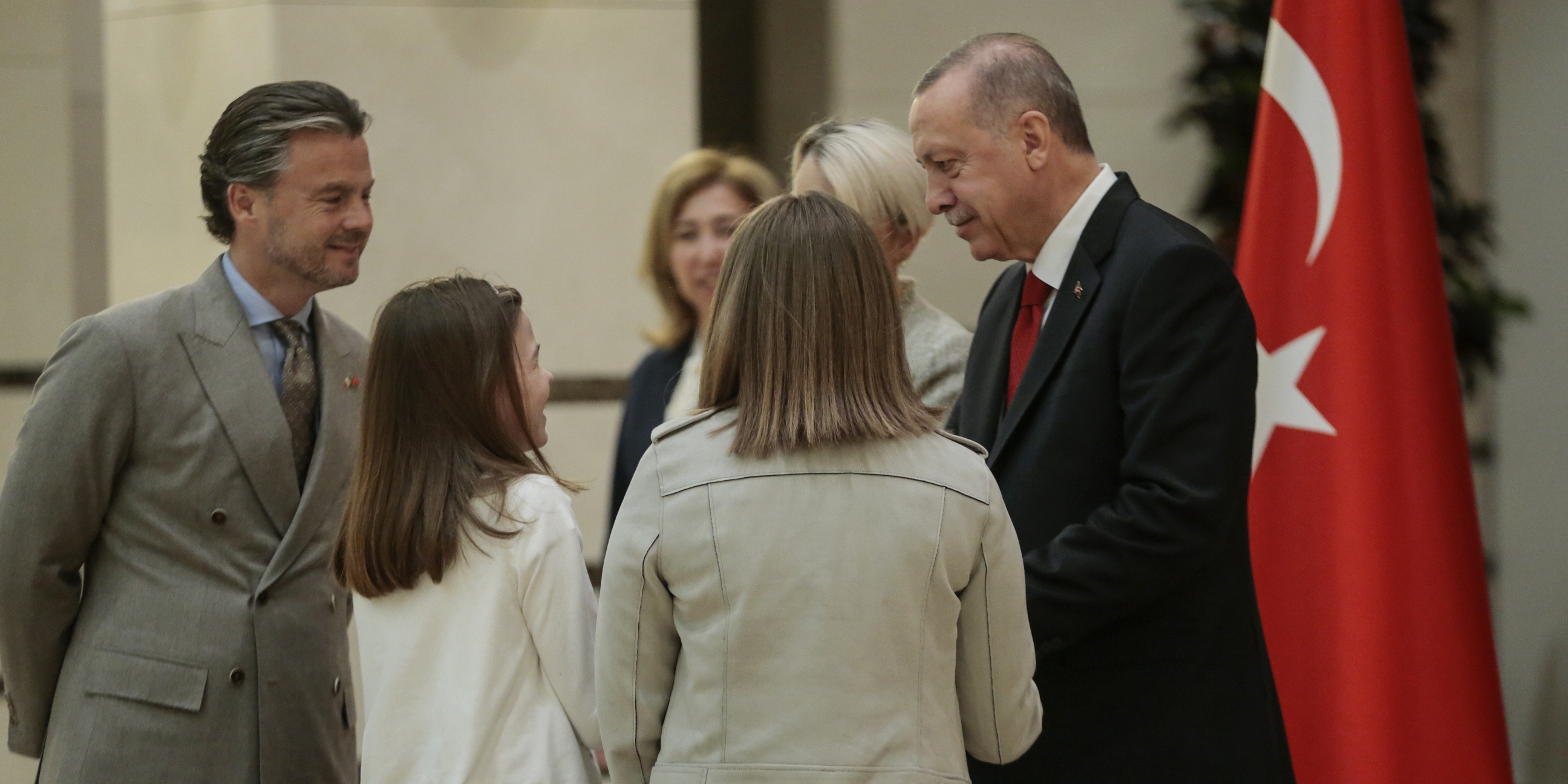 Erdoğan, Büyükelçi Mcguıness'in eşi Feilim McLaughlin, kızları Sabha ve Aingeal ile bir süre sohbet etti.