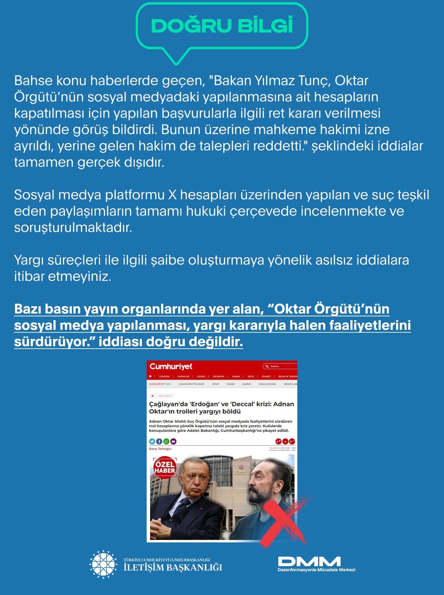 Bahse konu haberlerde geçen, "Bakan Yılmaz Tunç, Oktar Örgütü’nün sosyal medyadaki yapılanmasına ait hesapların kapatılması için yapılan başvurularla ilgili ret kararı verilmesi yönünde görüş bildirdi. Bunun üzerine mahkeme hâkimi izne ayrıldı, yerine gelen hâkim de talepleri reddetti." şeklindeki iddialar tamamen gerçek dışıdır.