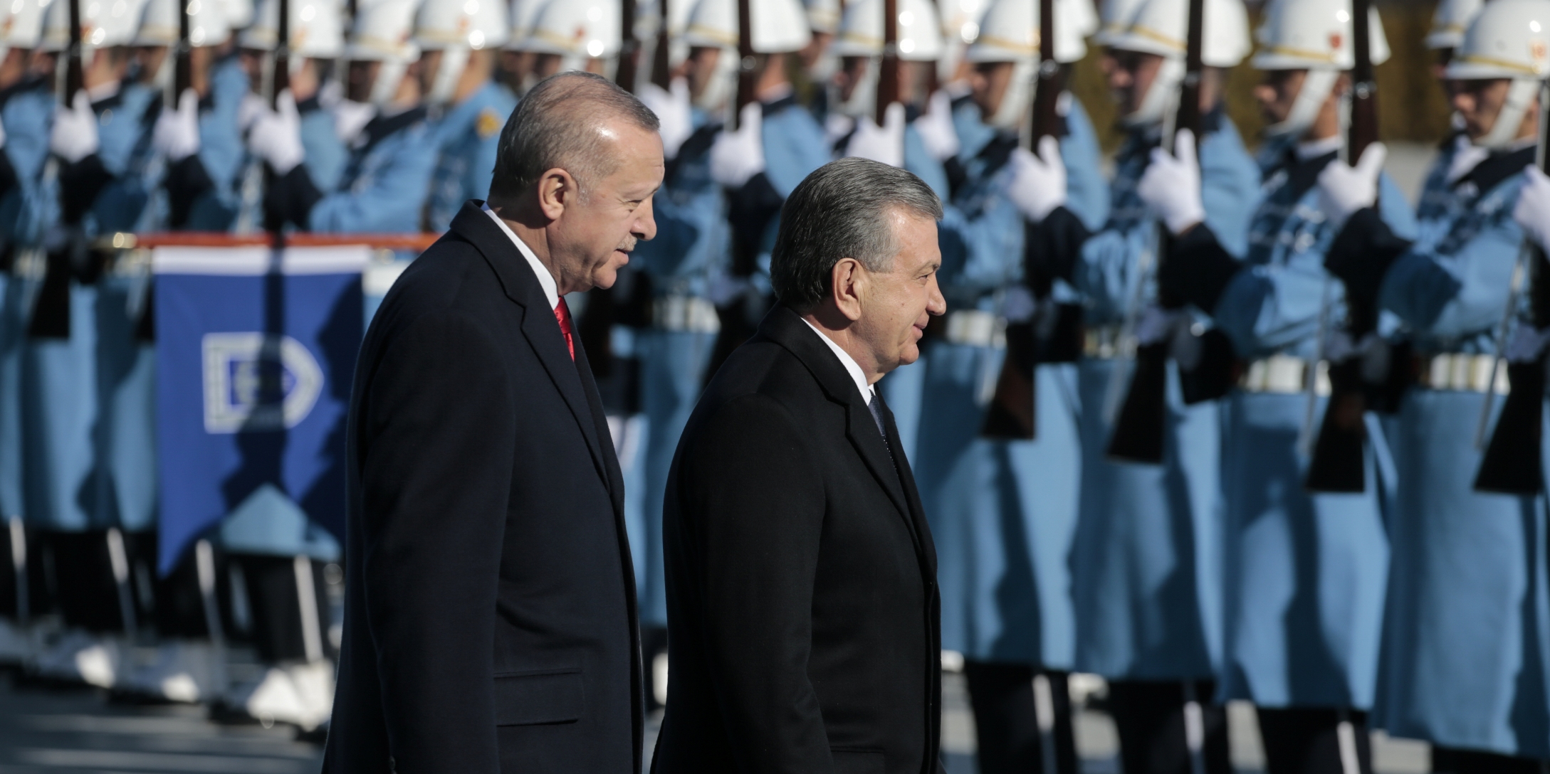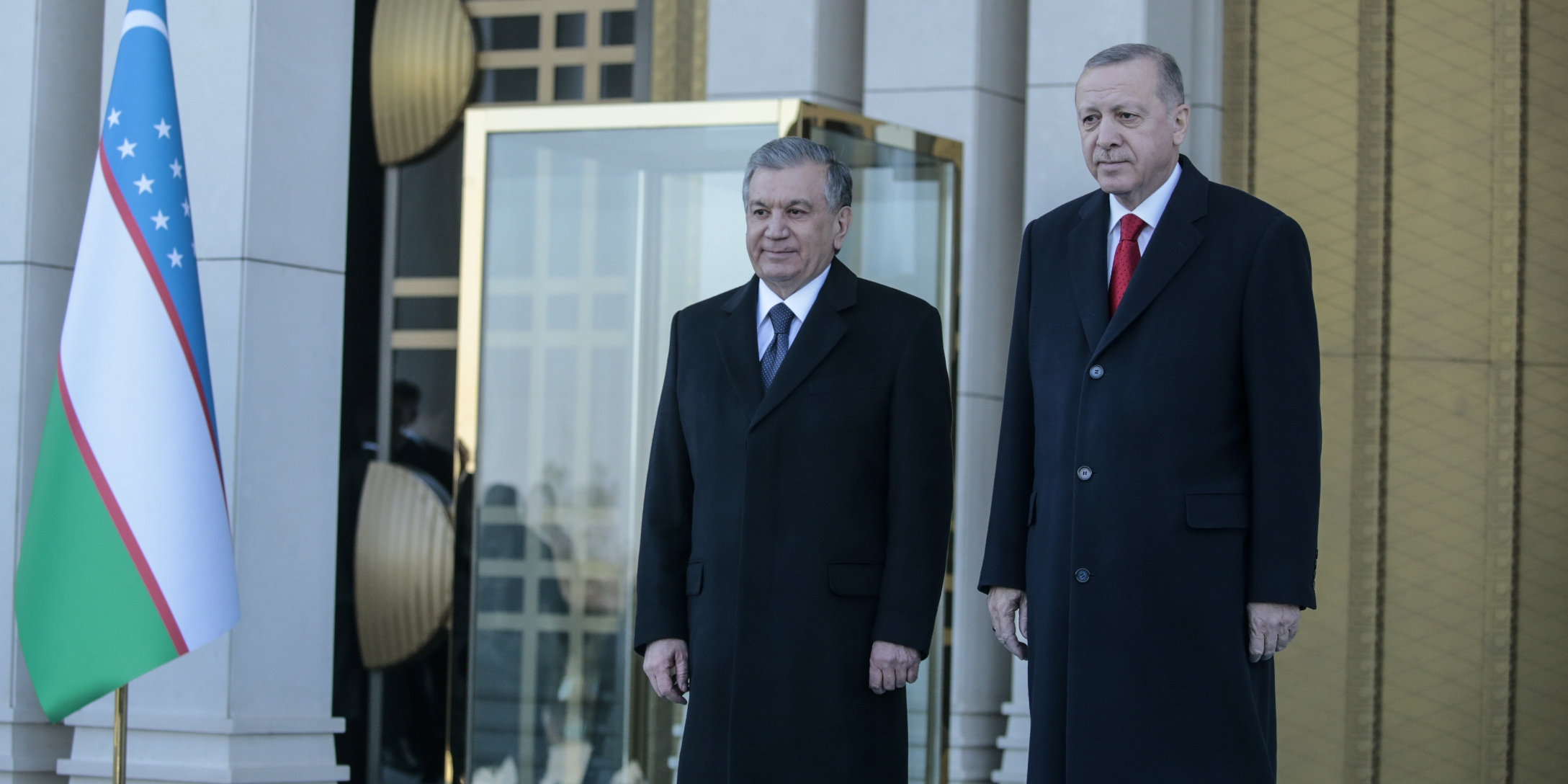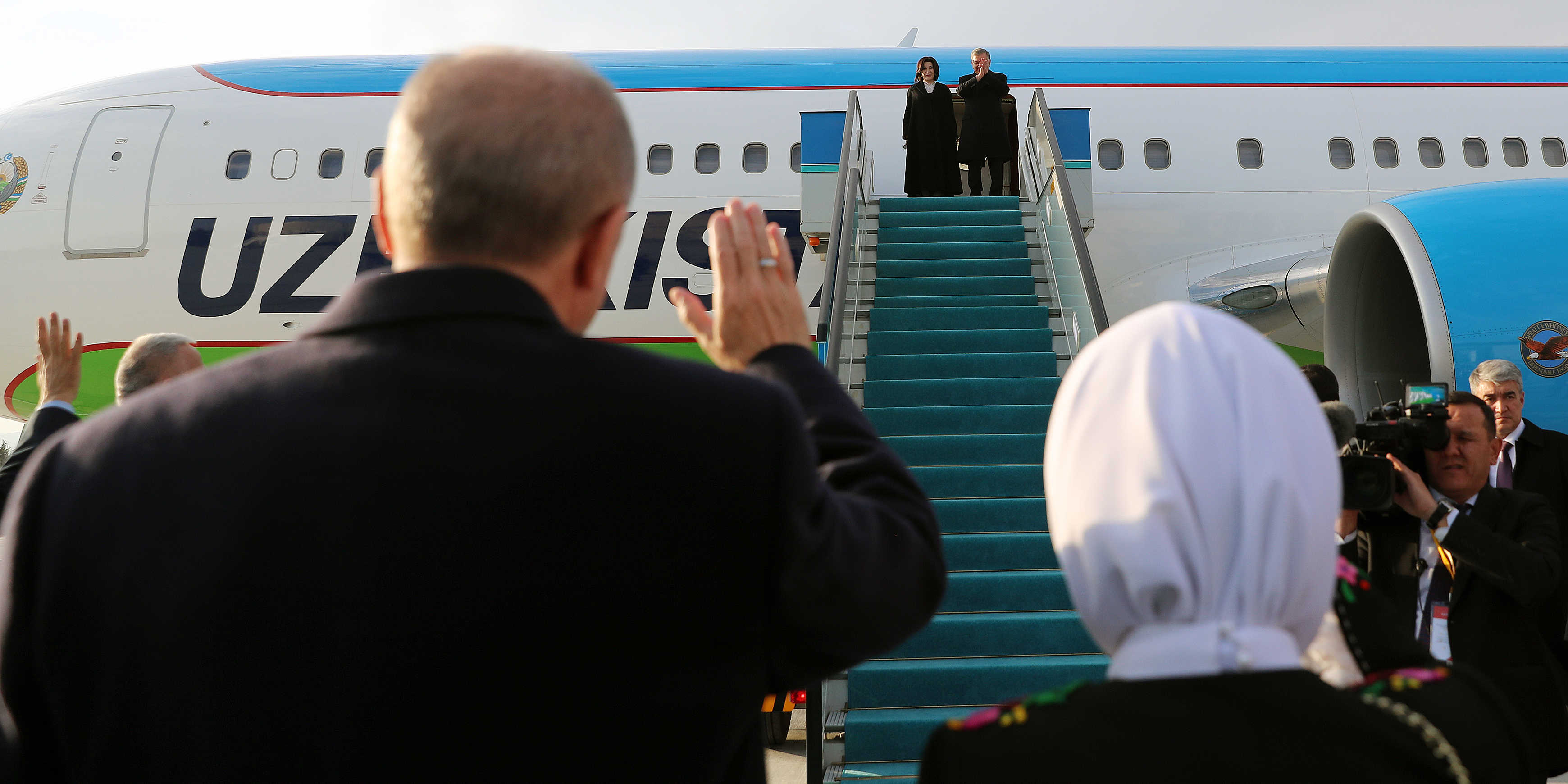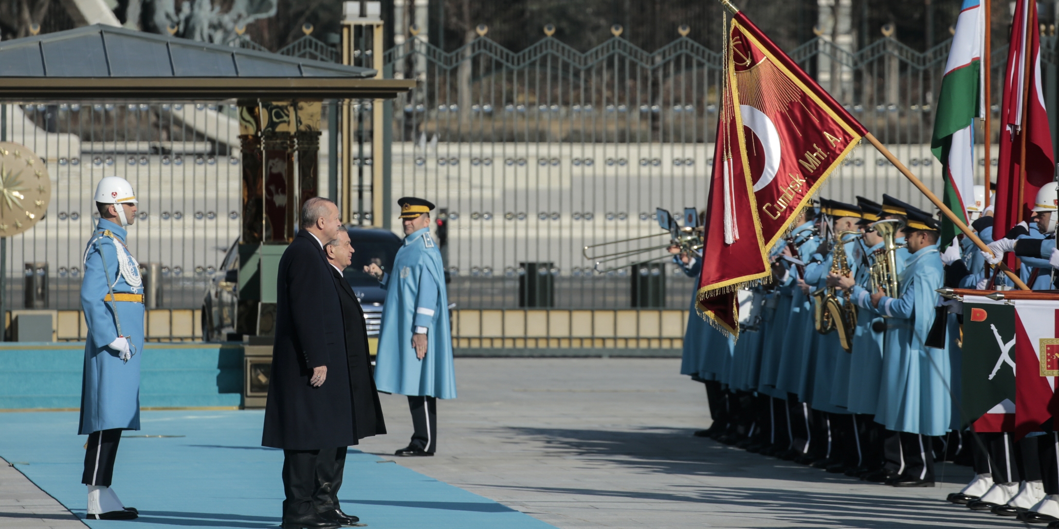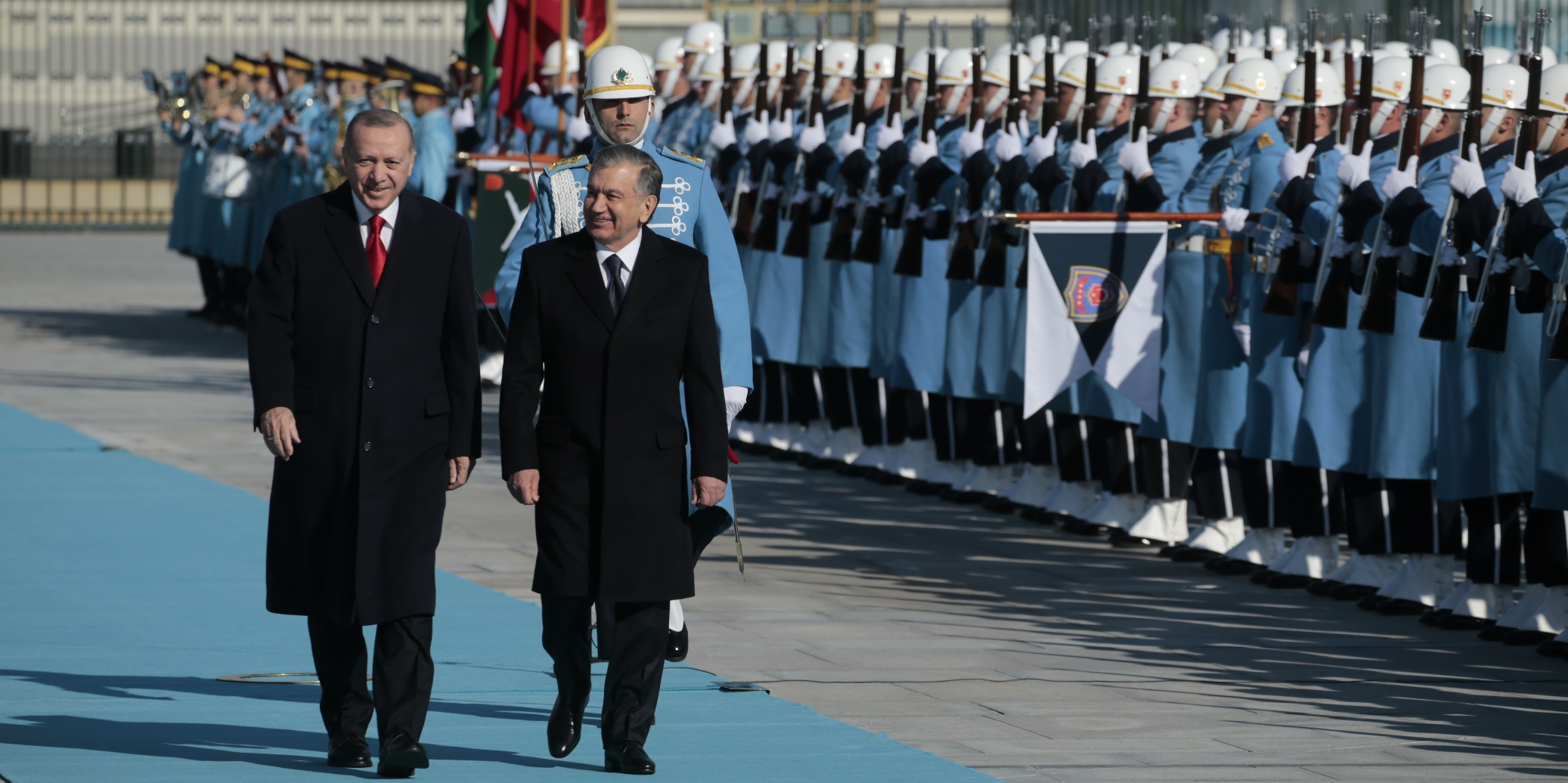 Cumhurbaşkanı Erdoğan, Mirziyoyev'i Cumhurbaşkanlığı Külliyesi'nin ana giriş kapısında karşıladı. Erdoğan ve Mirziyoyev'in tören alanındaki yerlerini almalarının ardından, 21 pare top atışı eşliğinde iki ülkenin milli marşları çalındı.