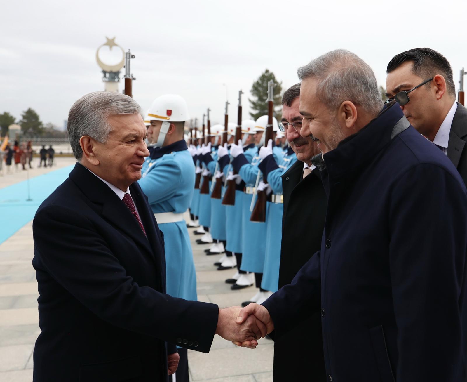 Özbekistan Cumhurbaşkanı Mirziyoyev, Muhafız Alayı Tören Kıtası'nı "Merhaba asker" diyerek selamladıktan sonra Cumhurbaşkanı Erdoğan ve Mirziyoyev, birbirlerine heyetlerini takdim etti.