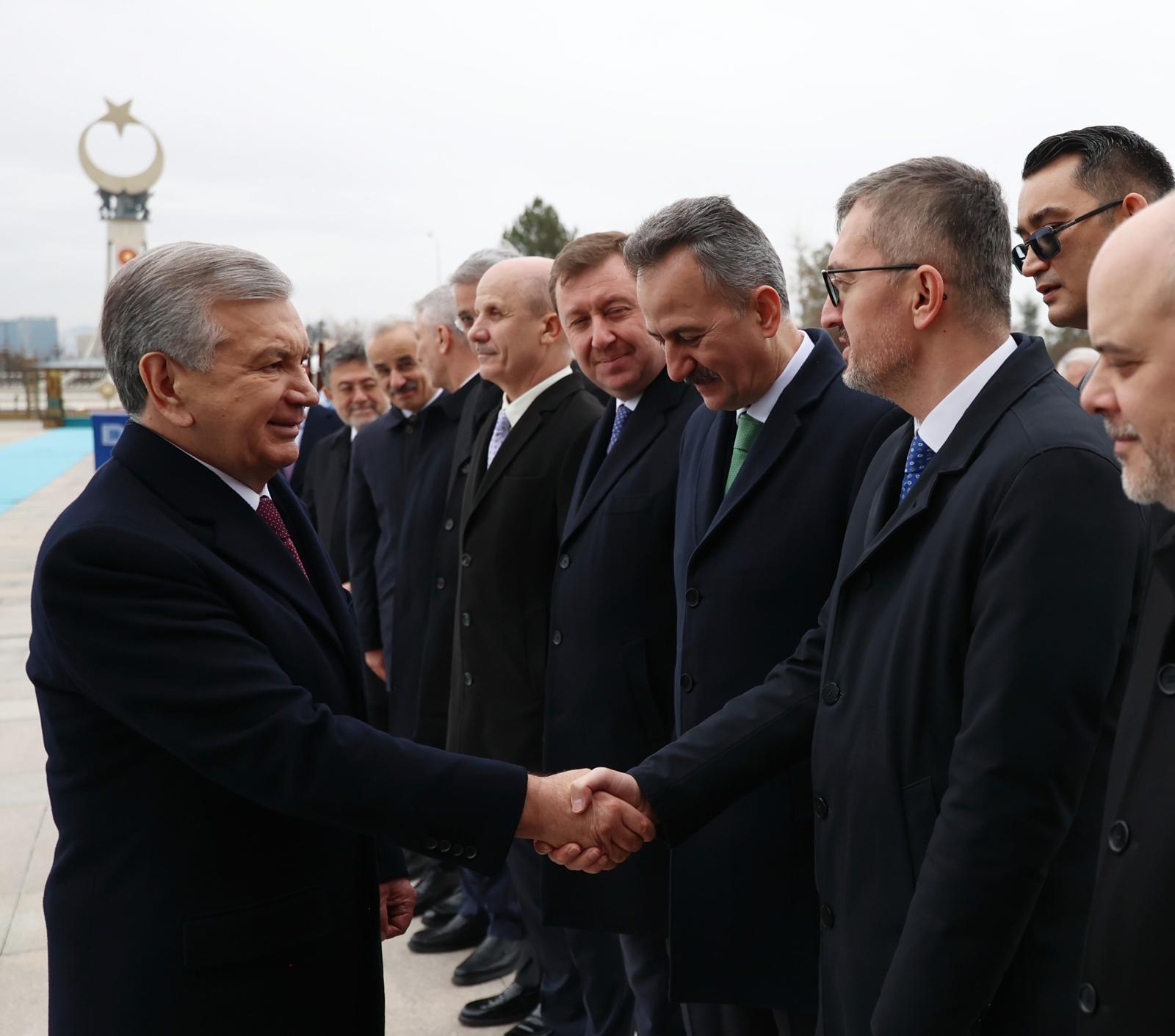 Cumhurbaşkanı Erdoğan ve Mirziyoyev'in tören alanındaki yerlerini almasının ardından, bando iki ülkenin millî marşlarını çaldı. Törende, tarihte kurulan 16 Türk devletini temsil eden bayraklar ve askerlere de yer verildi, 21 pare top atışı yapıldı.