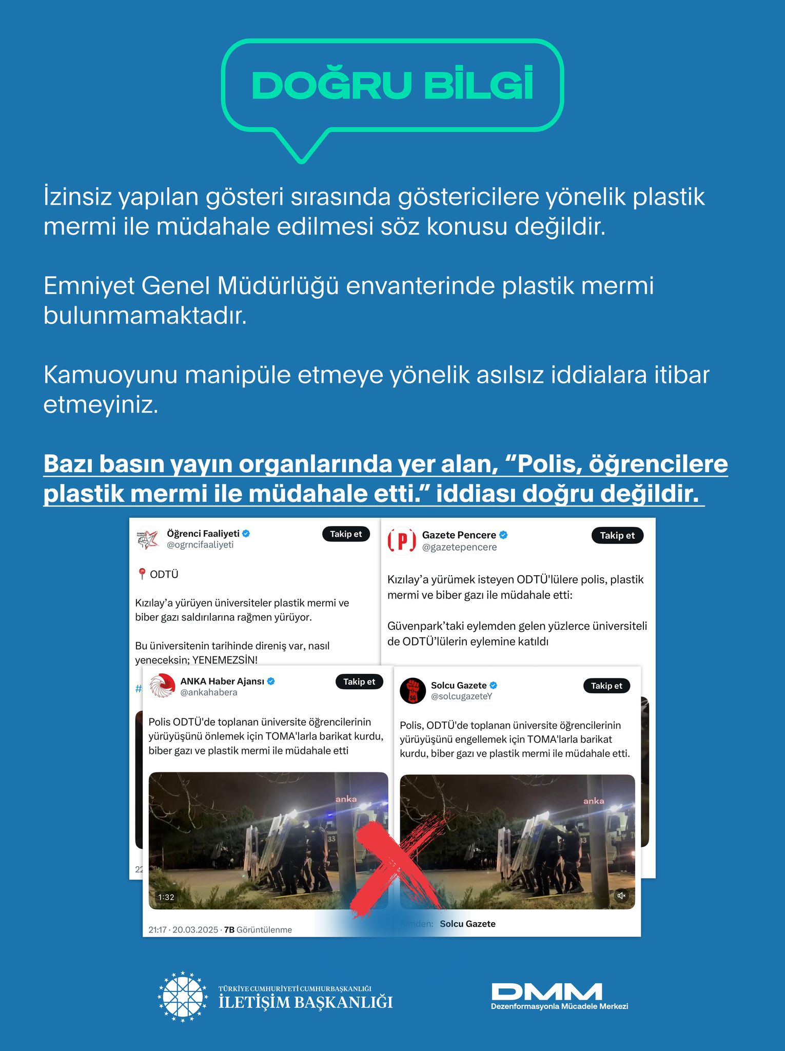 Bazı basın yayın organlarında yer alan, “Polis, öğrencilere plastik mermi ile müdahale etti.” iddiası doğru değildir.
