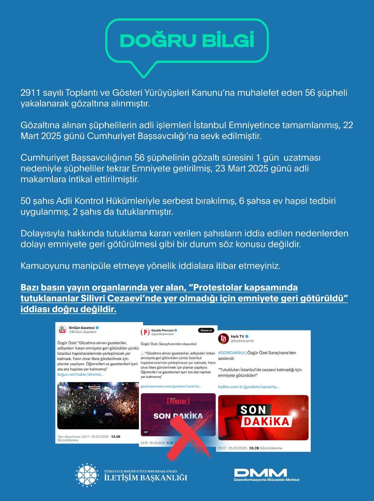 Bazı basın yayın organlarında yer alan, “Protestolar kapsamında tutuklananlar Silivri Cezaevi’nde yer olmadığı için emniyete geri götürüldü” iddiası doğru değildir.