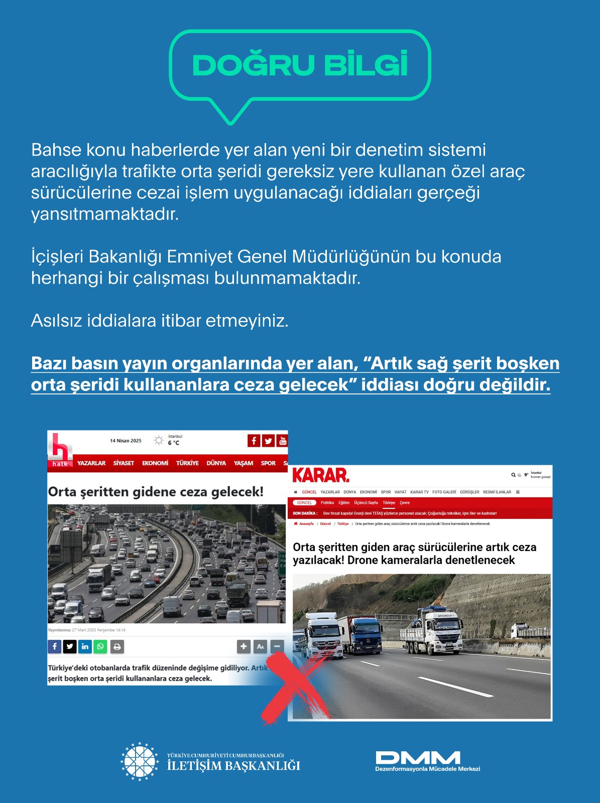 Bahse konu haberlerde yer alan yeni bir denetim sistemi aracılığıyla trafikte orta şeridi gereksiz yere kullanan özel araç sürücülerine cezai işlem uygulanacağı iddiaları gerçeği yansıtmamaktadır.