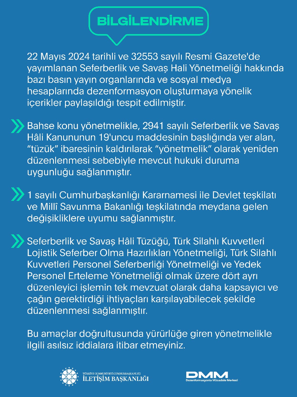 22 Mayıs 2024 tarihli ve 32553 sayılı Resmî Gazete'de yayımlanan Seferberlik ve Savaş Hâli Yönetmeliği hakkında bazı basın yayın organlarında ve sosyal medya hesaplarında dezenformasyon oluşturmaya yönelik içerikler paylaşıldığı tespit edilmiştir.