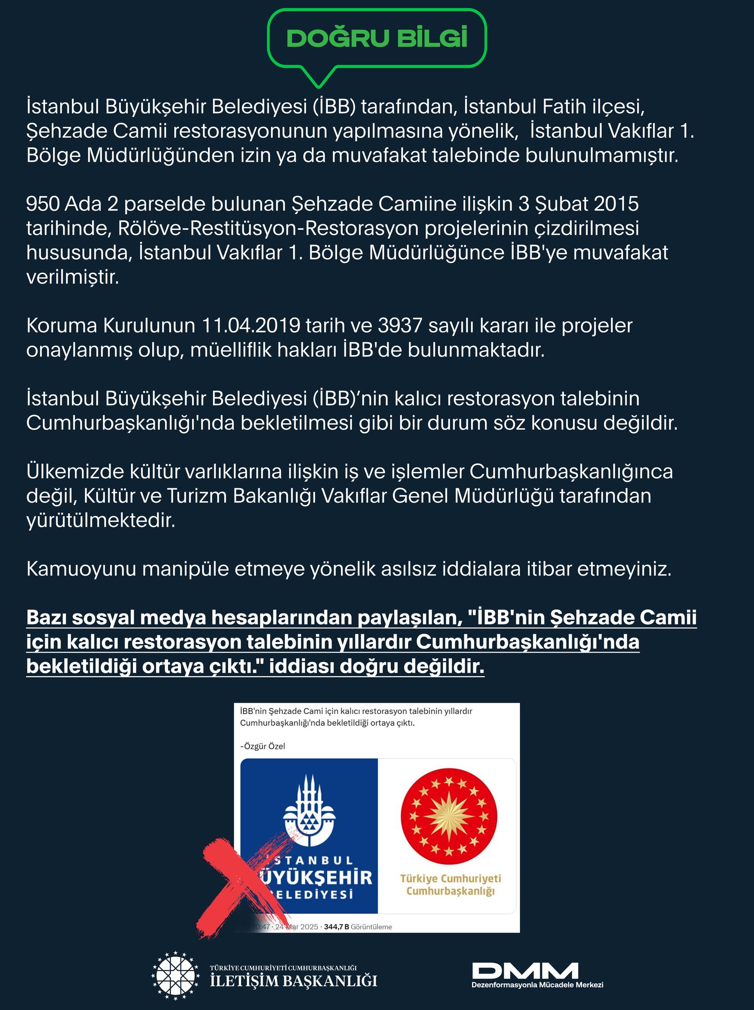 Bazı sosyal medya hesaplarından paylaşılan, "İBB'nin Şehzade Camii için kalıcı restorasyon talebinin yıllardır Cumhurbaşkanlığında bekletildiği ortaya çıktı." iddiası doğru değildir.