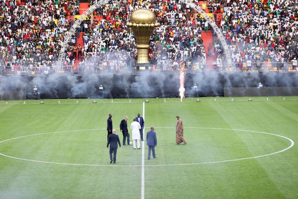 Cumhurbaşkanı Erdoğan ve diğer konuk devlet başkanları açılışı yapmak üzere stat zeminine davet edildi. Sahaya çıkarken bazı futbolcularla sohbet eden Cumhurbaşkanı Erdoğan, daha sonra orta sahada Sall ve diğer devlet başkanlarıyla pas yaptı.
