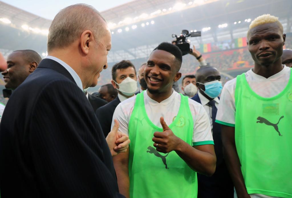 Gala maçı için sahaya çıkan Afrikalı eski oyuncular ve Senegal Milli Takımı'nın eski oyuncularıyla selamlaşan Cumhurbaşkanı Erdoğan, mevkidaşı Macky Sall ve diğer devlet başkanları futbolcularla paslaştı.