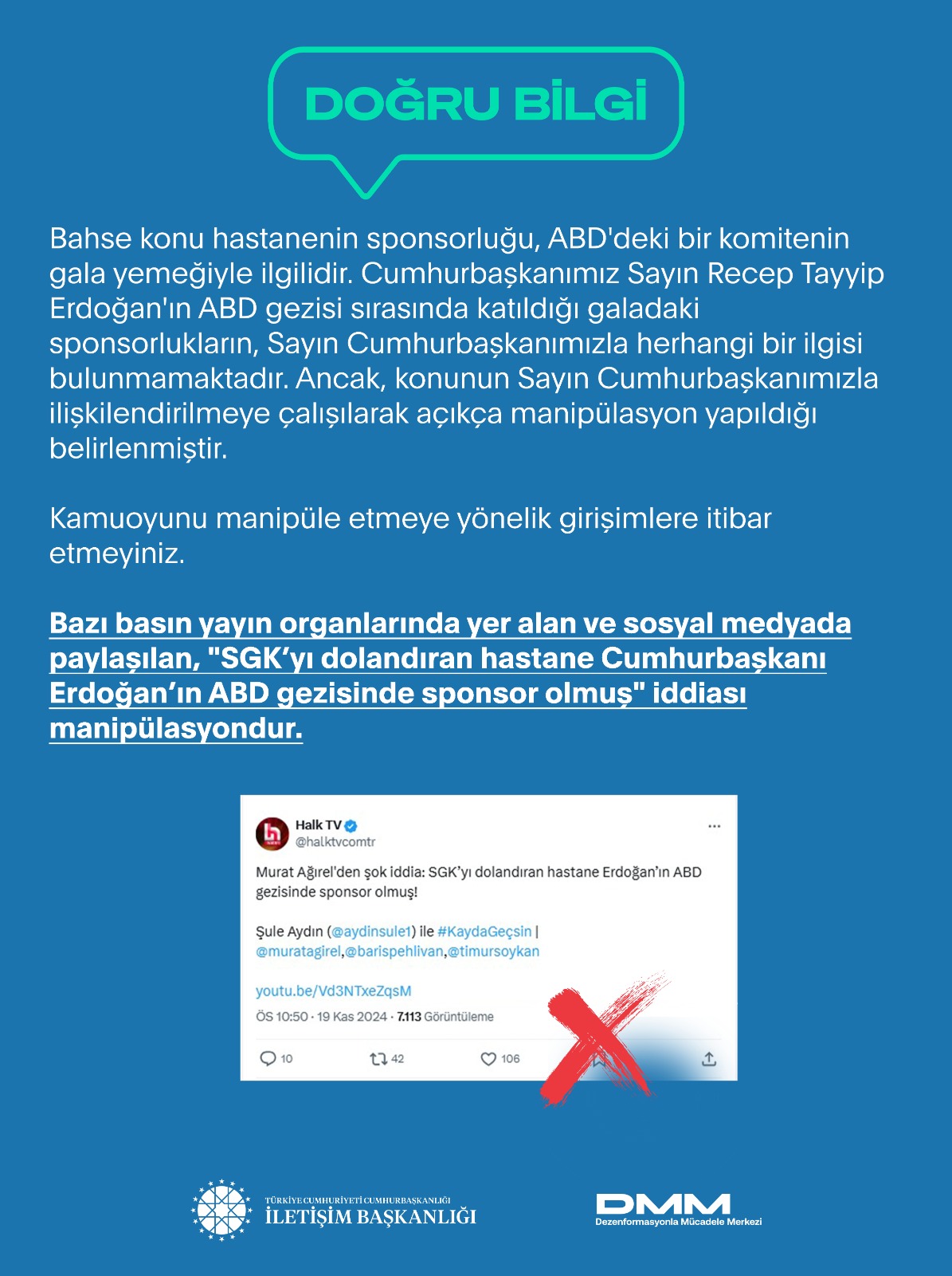 Bahse konu hastanenin sponsorluğu, ABD'deki bir komitenin gala yemeğiyle ilgilidir. Cumhurbaşkanımız Sayın Recep Tayyip Erdoğan'ın ABD gezisi sırasında katıldığı galadaki sponsorlukların, Sayın Cumhurbaşkanımızla herhangi bir ilgisi bulunmamaktadır. Ancak, konunun Sayın Cumhurbaşkanımızla ilişkilendirilmeye çalışılarak açıkça manipülasyon yapıldığı belirlenmiştir.