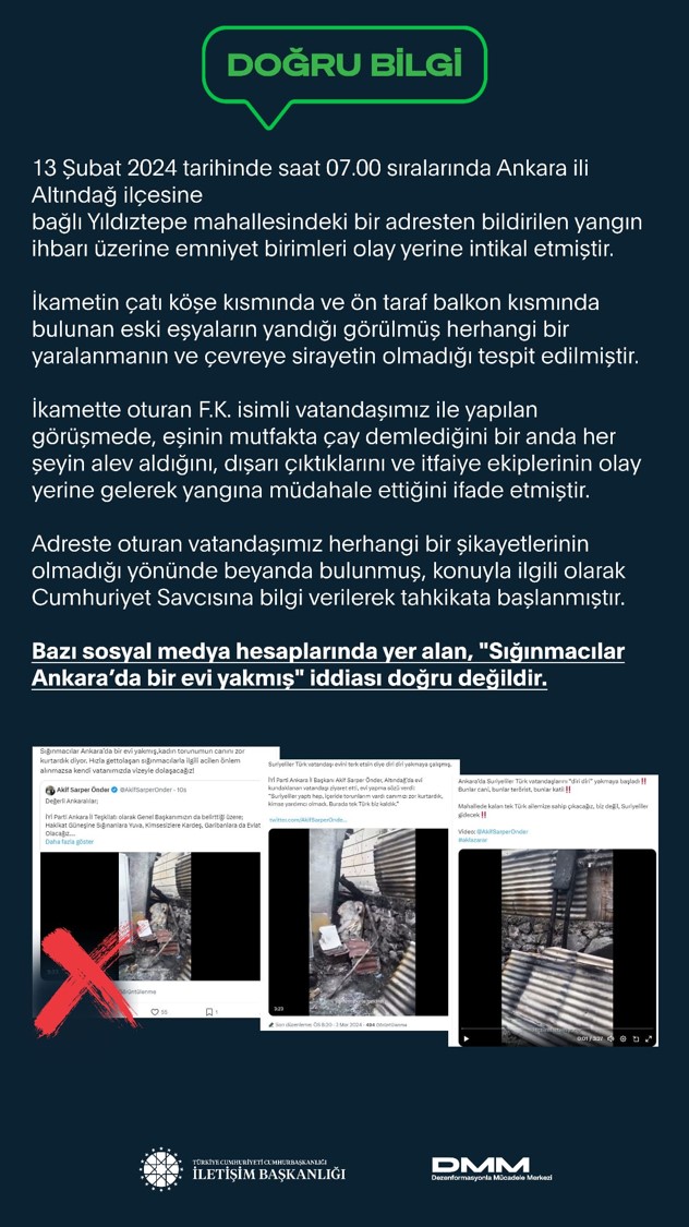 Bazı sosyal medya hesaplarında yer alan, "Sığınmacılar Ankara’da bir evi yakmış" iddiası doğru değildir.