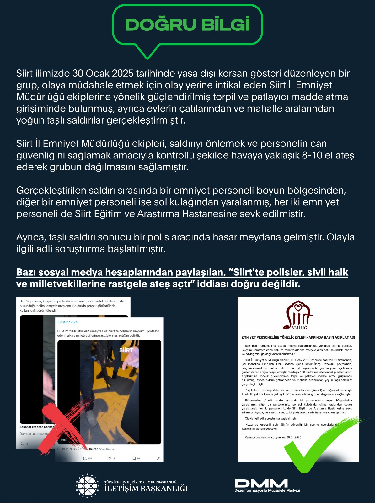 Siirt ilimizde 30 Ocak 2025 tarihinde yasa dışı korsan gösteri düzenleyen bir grup, olaya müdahale etmek için olay yerine intikal eden Siirt İl Emniyet Müdürlüğü ekiplerine yönelik güçlendirilmiş torpil ve patlayıcı madde atma girişiminde bulunmuş, ayrıca evlerin çatılarından ve mahalle aralarından yoğun taşlı saldırılar gerçekleştirmiştir.