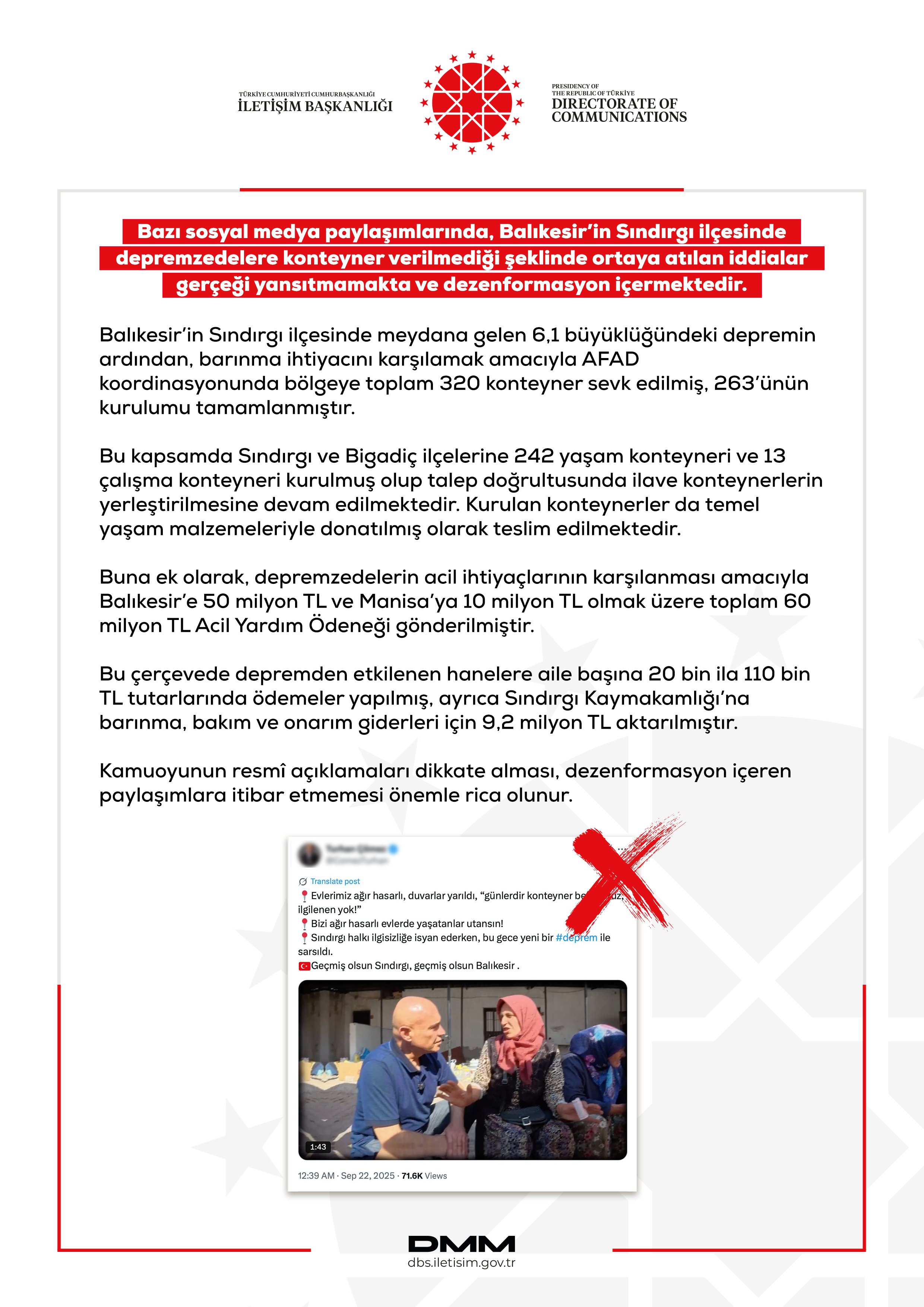 Bazı sosyal medya paylaşımlarında, Balıkesir’in Sındırgı ilçesinde depremzedelere konteyner verilmediği şeklinde ortaya atılan iddialar gerçeği yansıtmamakta ve dezenformasyon içermektedir.