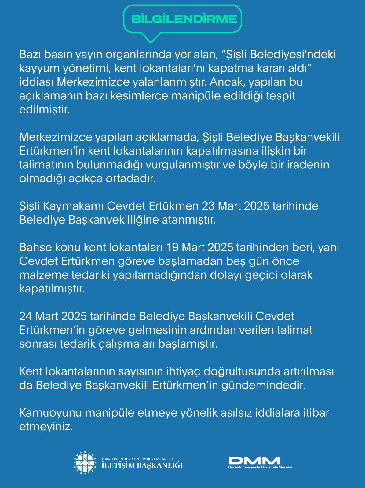 Bazı basın yayın organlarında yer alan, “Şişli Belediyesi'ndeki kayyum yönetimi, Kent Lokantaları'nı kapatma kararı aldı” iddiası doğru değildir.