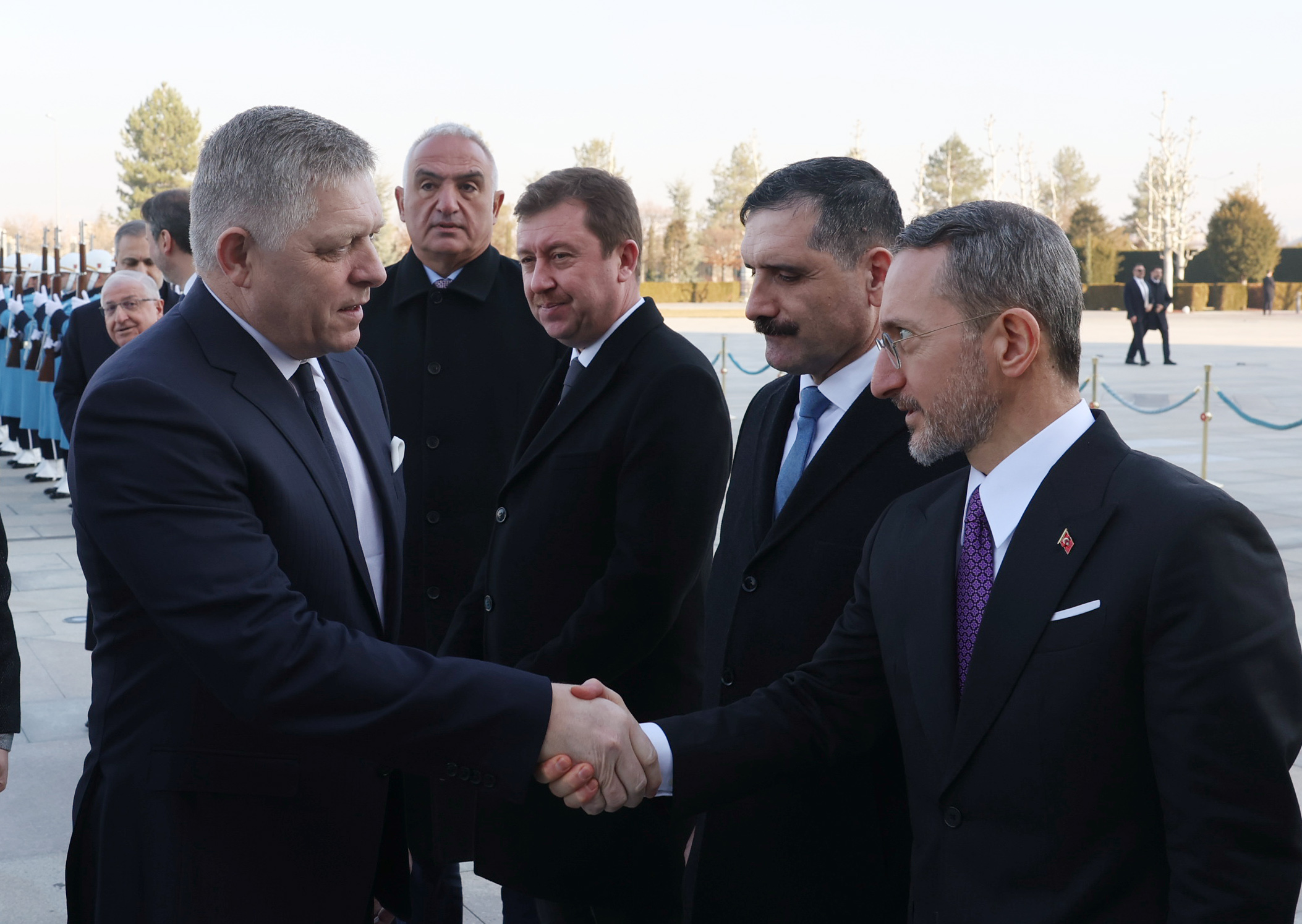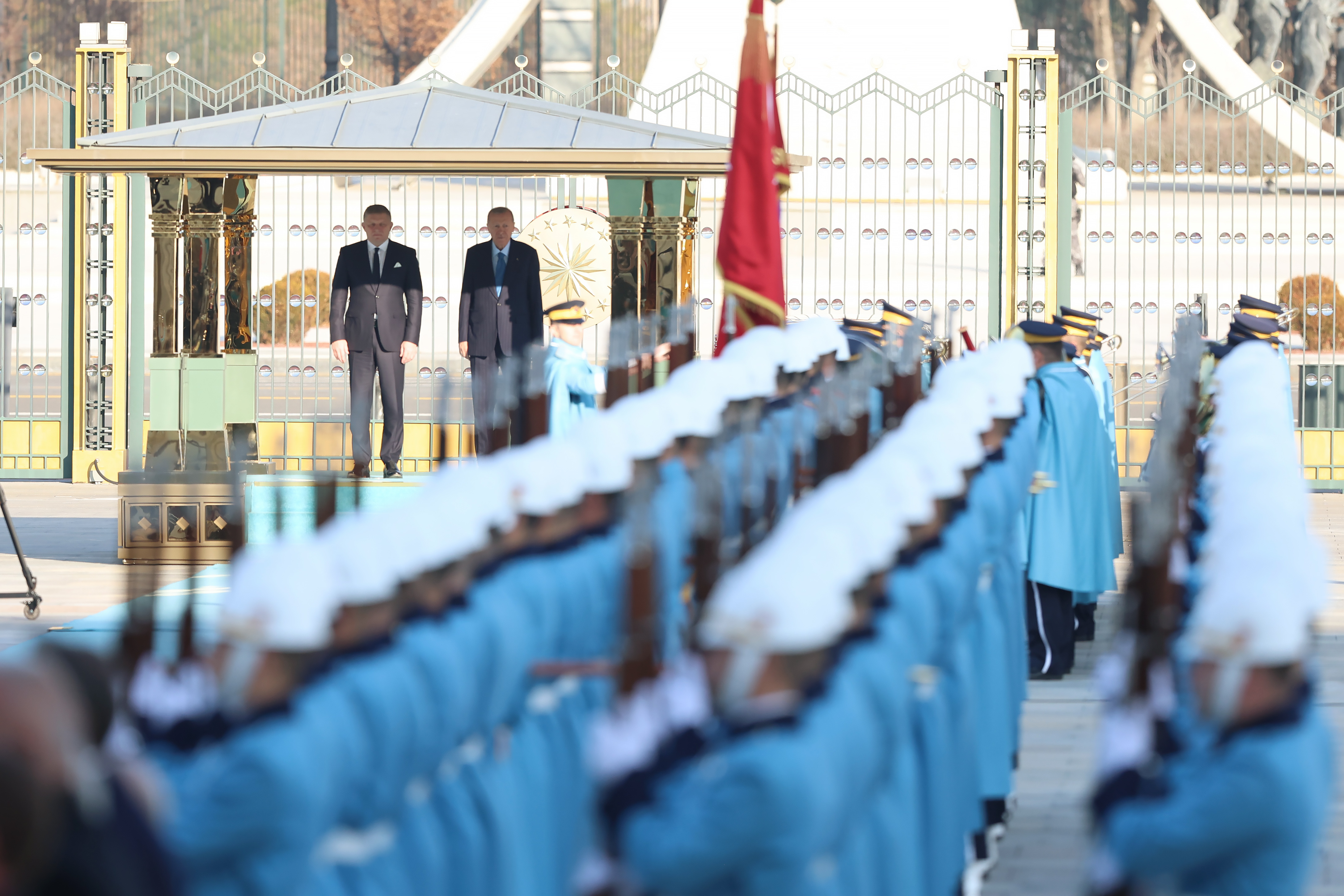 Slovakya Başbakanı Fico, Muhafız Alayı Tören Kıtası'nı "Merhaba asker" diyerek selamladı. Cumhurbaşkanı Erdoğan ve Slovakya Başbakanı Fico birbirlerine heyetlerini takdim etti.