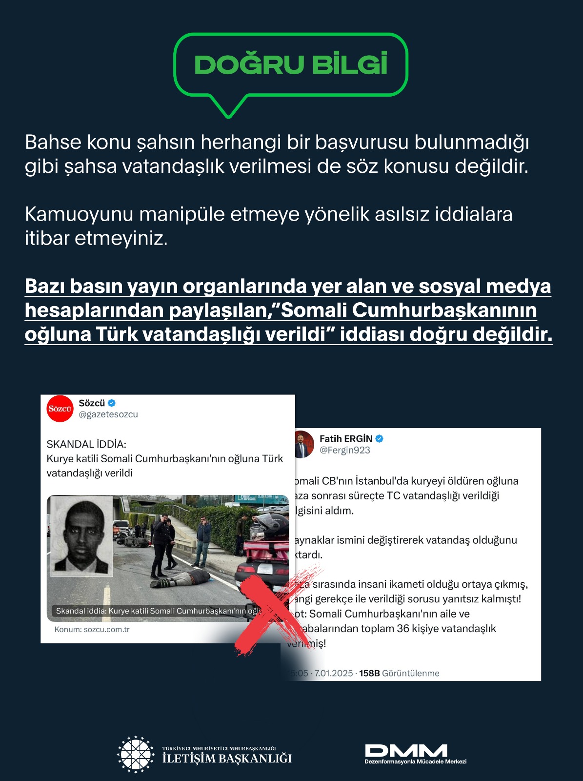 Bazı basın yayın organlarında yer alan ve sosyal medya hesaplarından paylaşılan, "Somali Cumhurbaşkanının oğluna Türk vatandaşlığı verildi" iddiası doğru değildir.