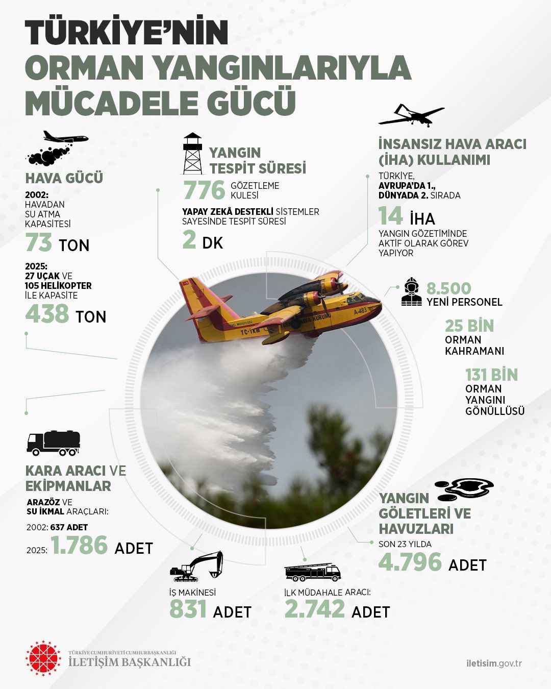 Yangınlara karşı kara ve hava unsurlarımız azami gayretle görev yapmakta olup riskli bölgelerde ekip ve ekipman takviyeleri gerçekleştirilmiştir. Gelişmeler anlık olarak takip edilmekte ve gerekli koordinasyon, Tarım ve Orman Bakanlığına bağlı Orman Genel Müdürlüğü tarafından sağlanmaktadır.