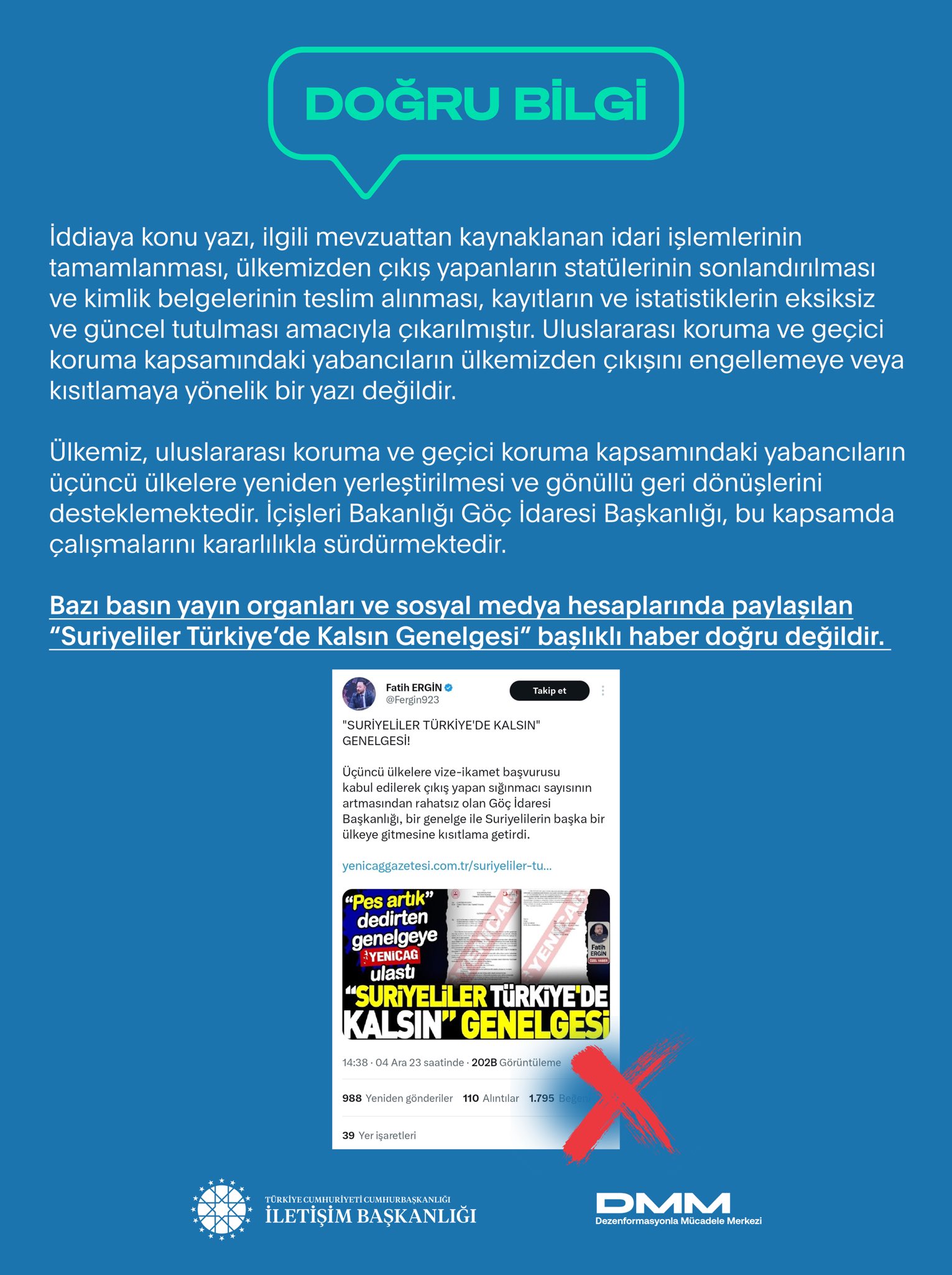 Bazı basın yayın organları ve sosyal medya hesaplarında paylaşılan “Suriyeliler Türkiye’de Kalsın Genelgesi” başlıklı haber doğru değildir.