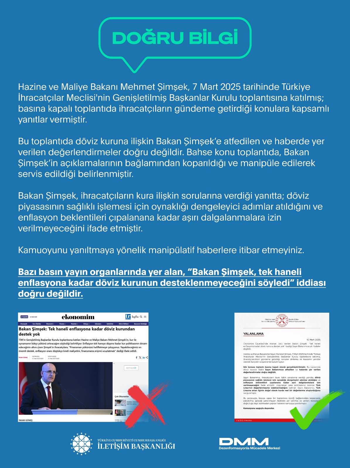 Bu toplantıda döviz kuruna ilişkin Bakan Şimşek’e atfedilen ve haberde yer verilen değerlendirmeler doğru değildir. Bahse konu toplantıda, Bakan Şimşek’in açıklamalarının bağlamından koparıldığı ve manipüle edilerek servis edildiği belirlenmiştir.