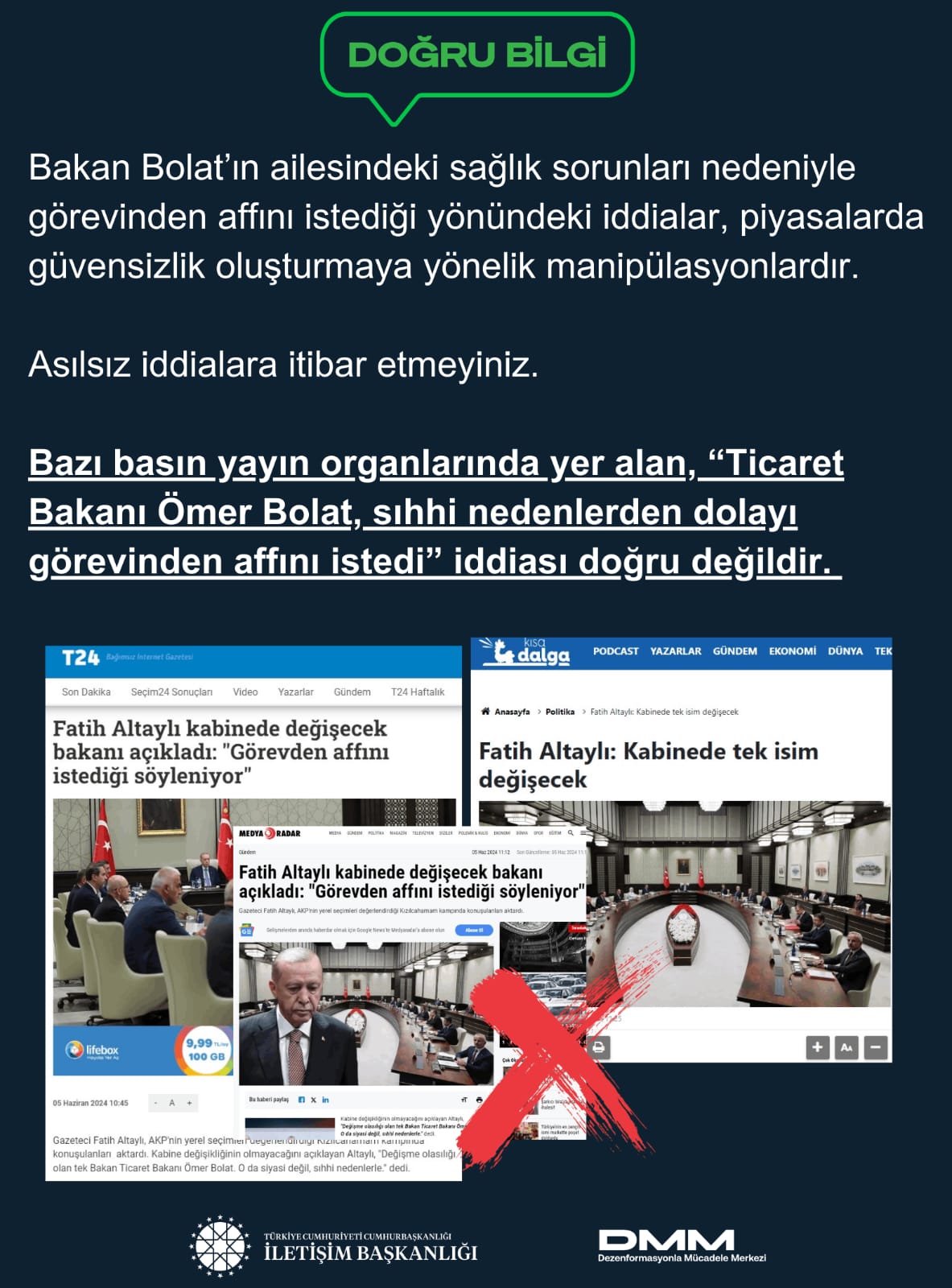 Bazı basın yayın organlarında yer alan, “Ticaret Bakanı Ömer Bolat, sıhhi nedenlerden dolayı görevinden affını istedi” iddiası doğru değildir.