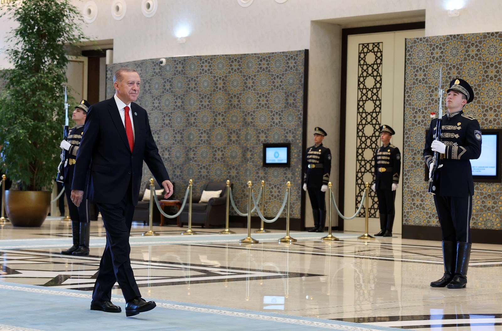 Cumhurbaşkanı Recep Tayyip Erdoğan, "Ebedi Şehir" Kongre Merkezi'ne gelişinde Mirziyoyev tarafından karşılandı.