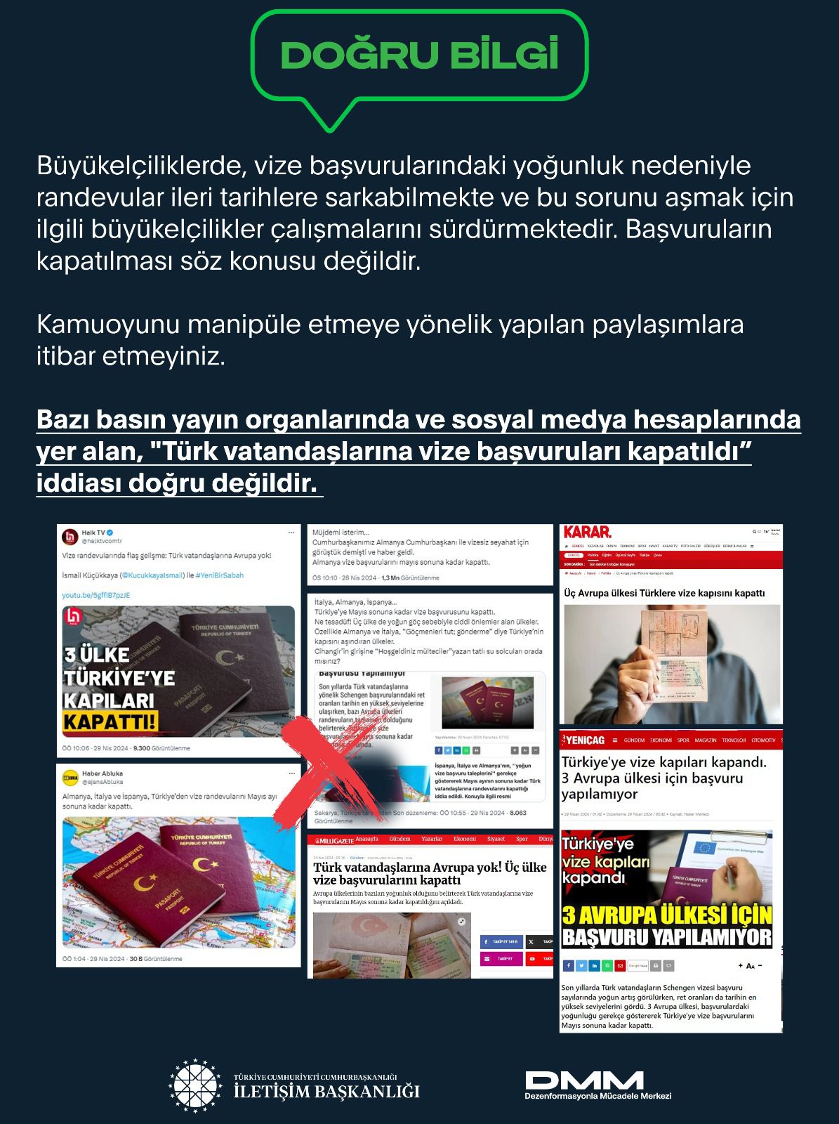 Bazı basın yayın organlarında ve sosyal medya hesaplarında yer alan, "Türk vatandaşlarına vize başvuruları kapatıldı” iddiası doğru değildir.