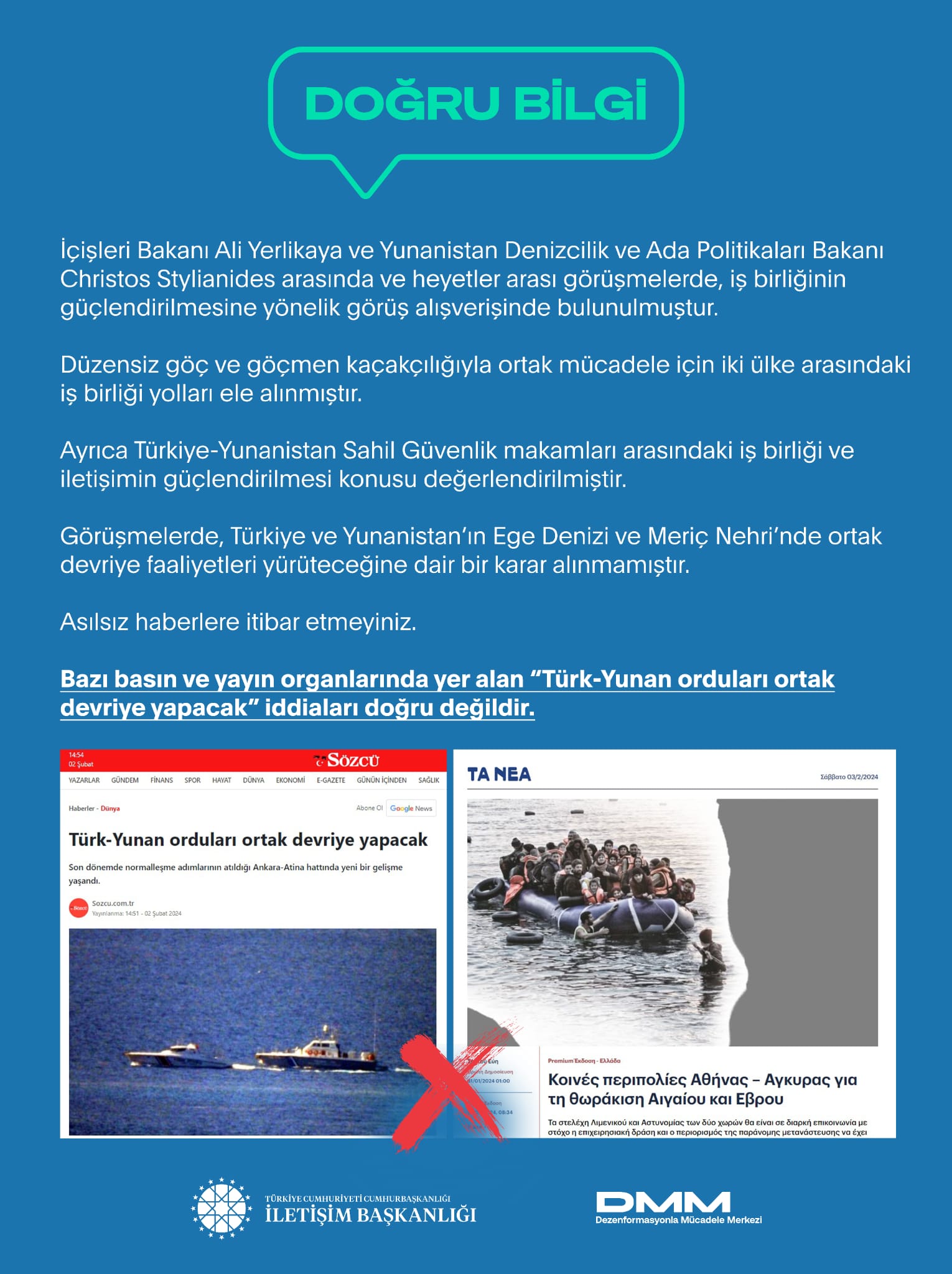 Bazı basın ve yayın organlarında yer alan “Türk-Yunan orduları ortak devriye yapacak” iddiaları doğru değildir.