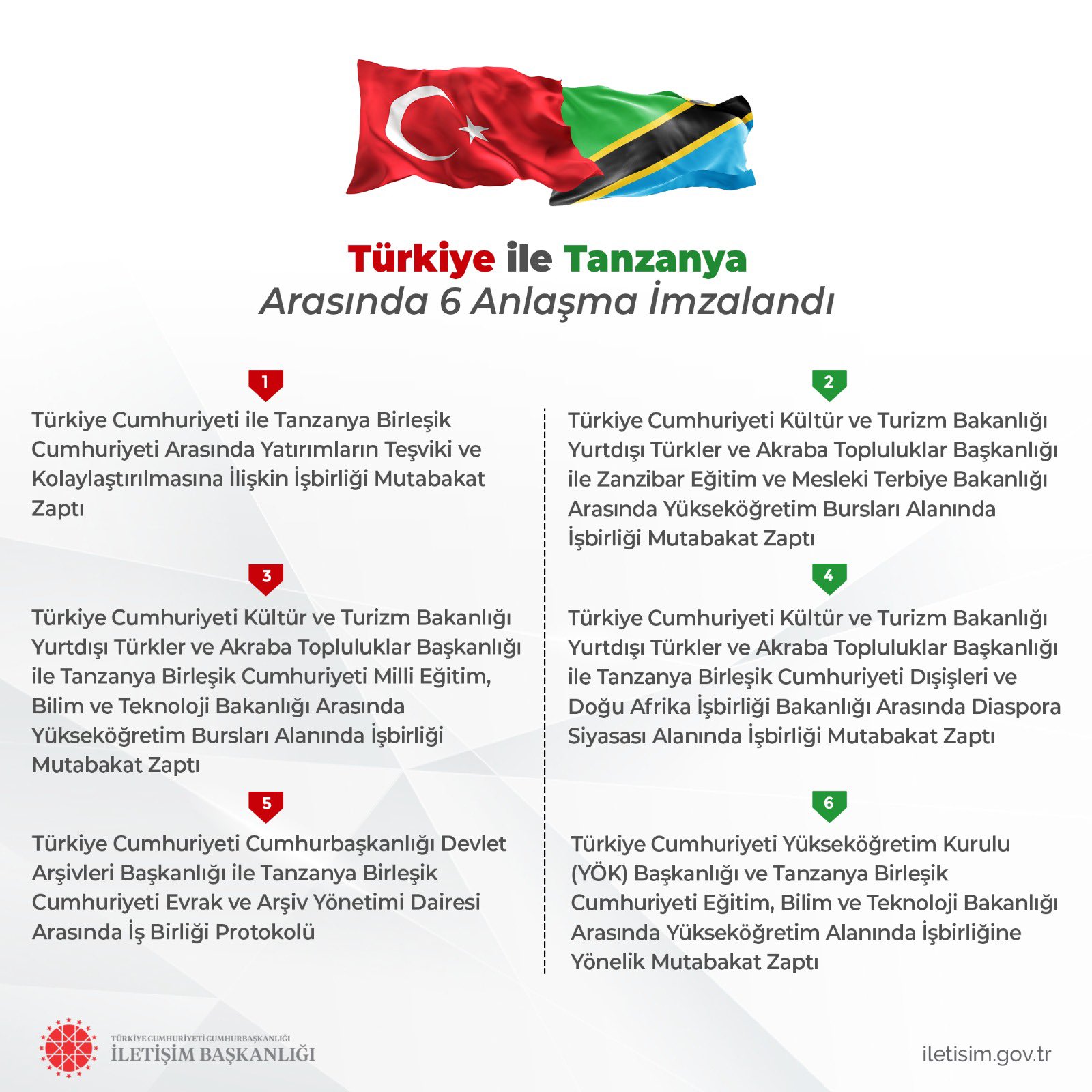 Türkiye Cumhuriyeti ile Tanzanya Birleşik Cumhuriyeti arasında yatırımların teşviki ve kolaylaştırılması, yükseköğretim, arşiv, yükseköğretim bursları alanlarında 6 anlaşma imzalandı.